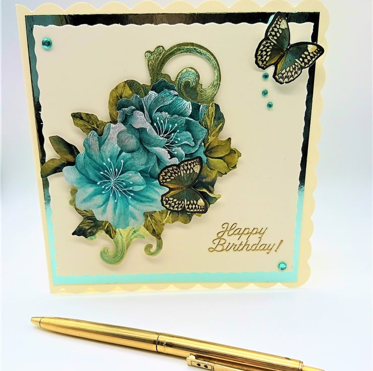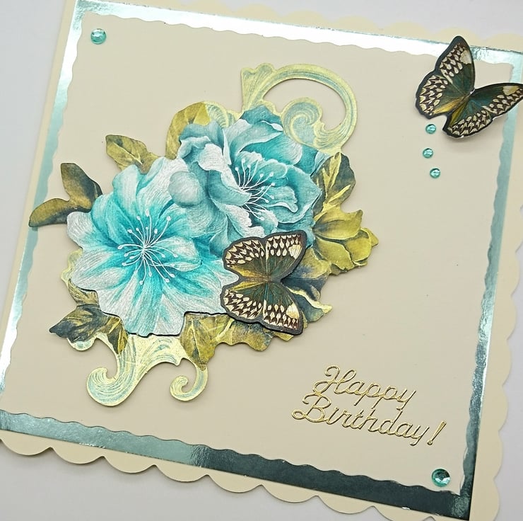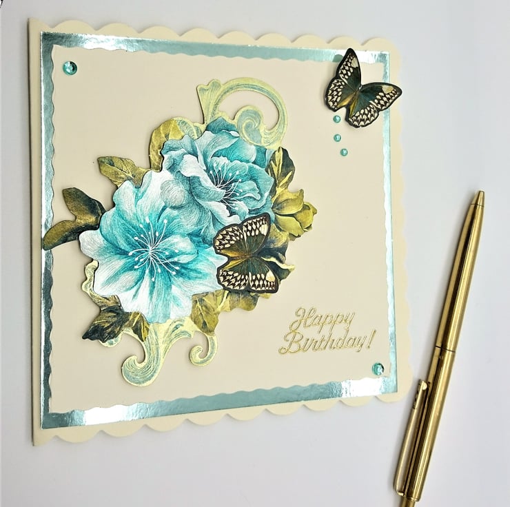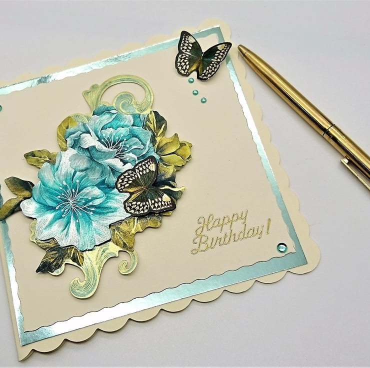 Happy Birthday Card with beautiful teal foiled flowers and contrasting brown and white butterflies, handmade with love, in my wee studio in Argyll, Scotland. FREE Postage to U.K.