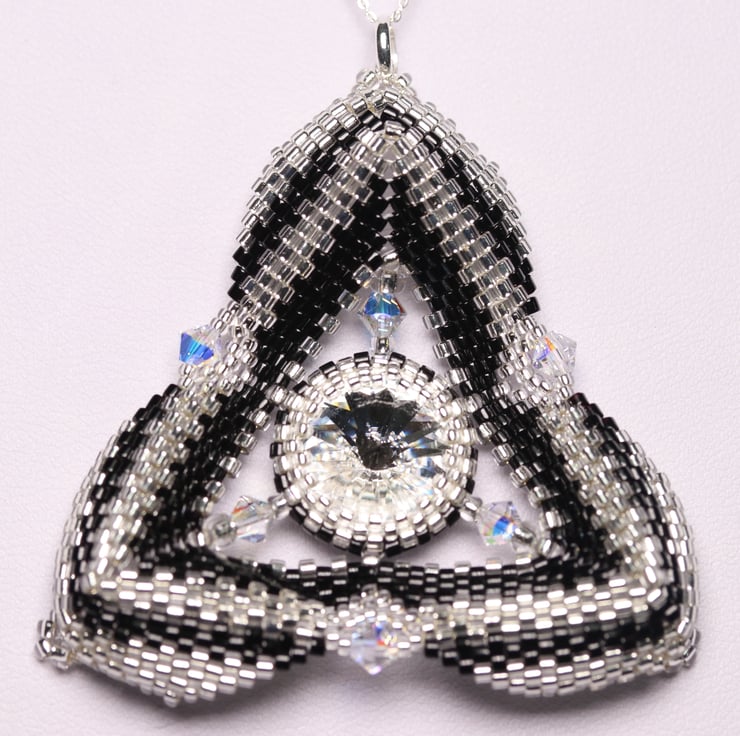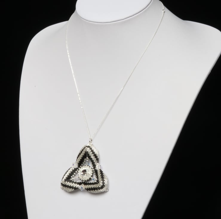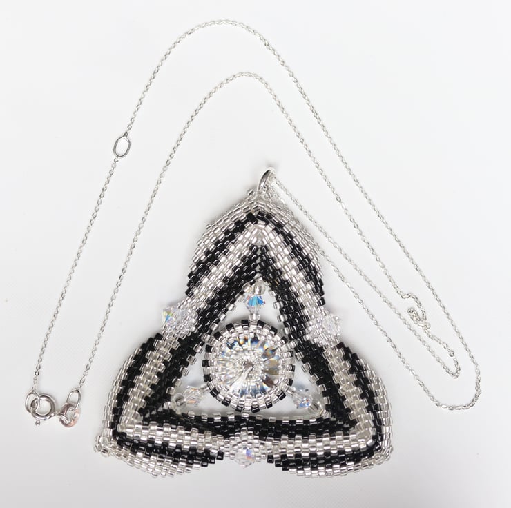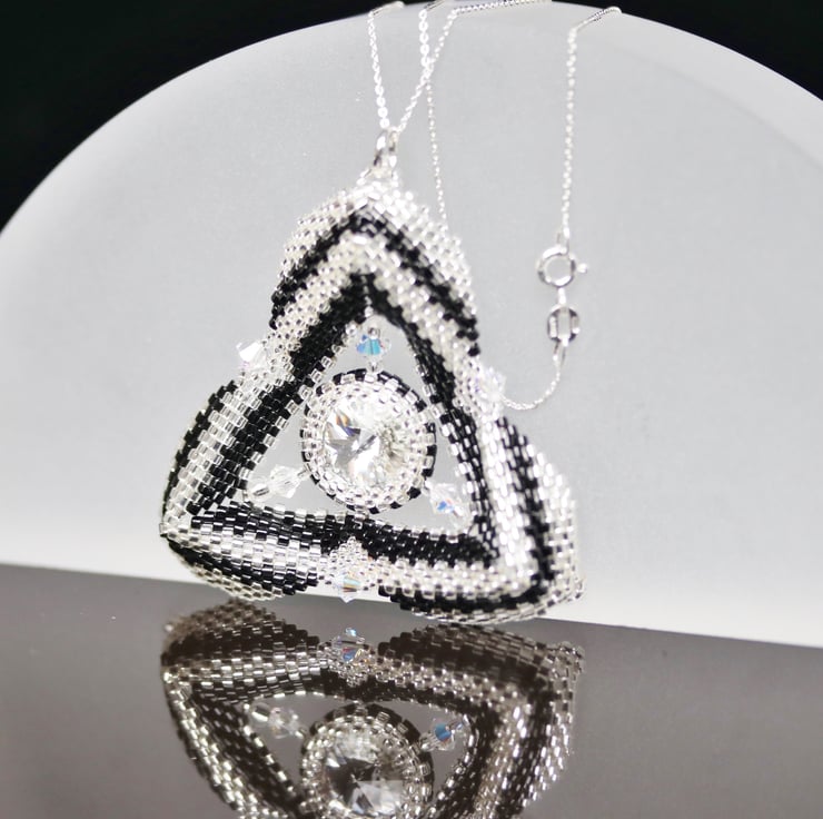 This sparkly beaded pendant in a triangular shape is made by a process called beadweaving. Tiny seed beads are sewn together to create the shape. I have used silver lined crystal and shiny black delica beads in this pendant. These are sewn around a stunning 14mm Swarovski crystal rivoli. Some sparkly (AB) Swarovski crystals finish the pendant, which hangs from a delicate sterling silver trace chain finished with a matching bolt ring clasp.
