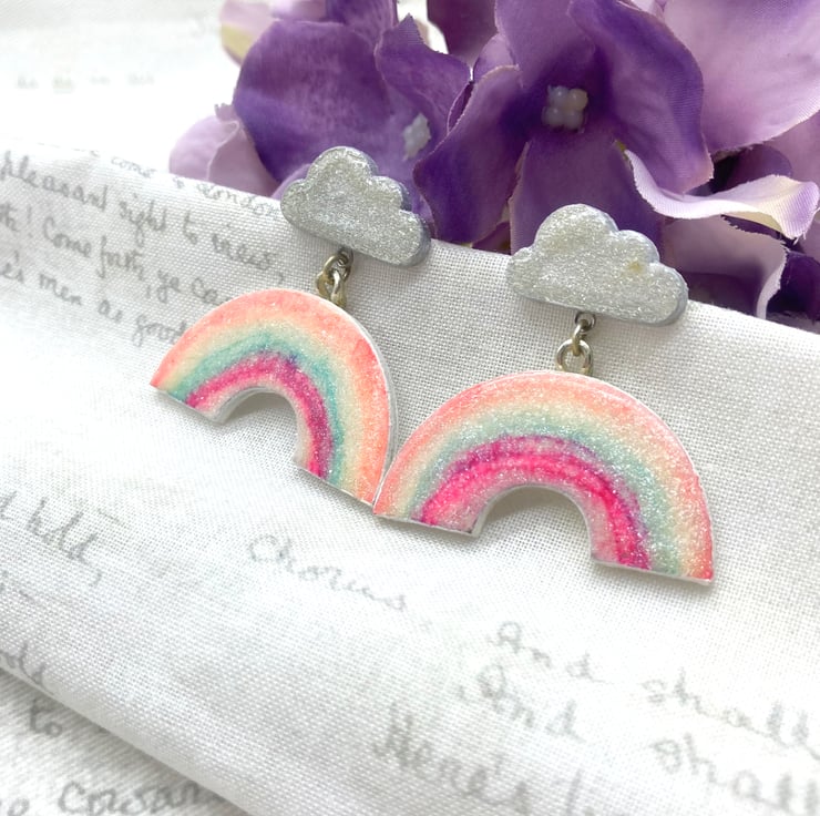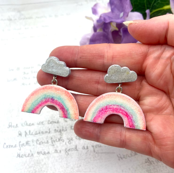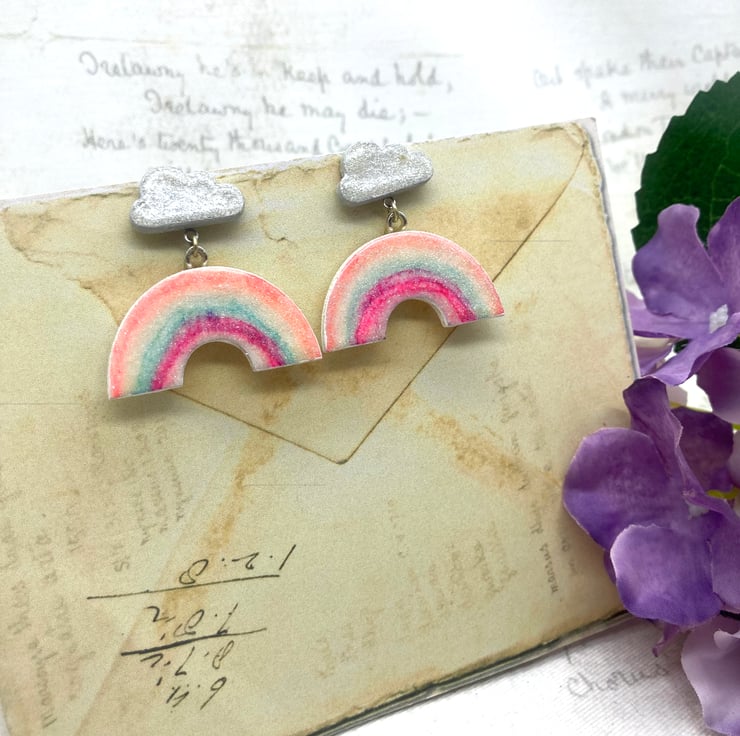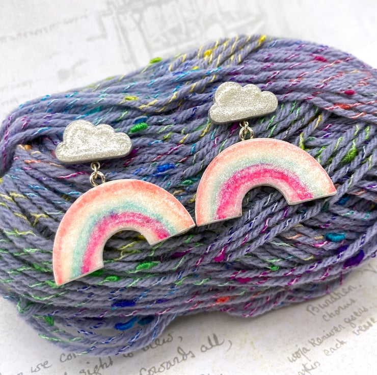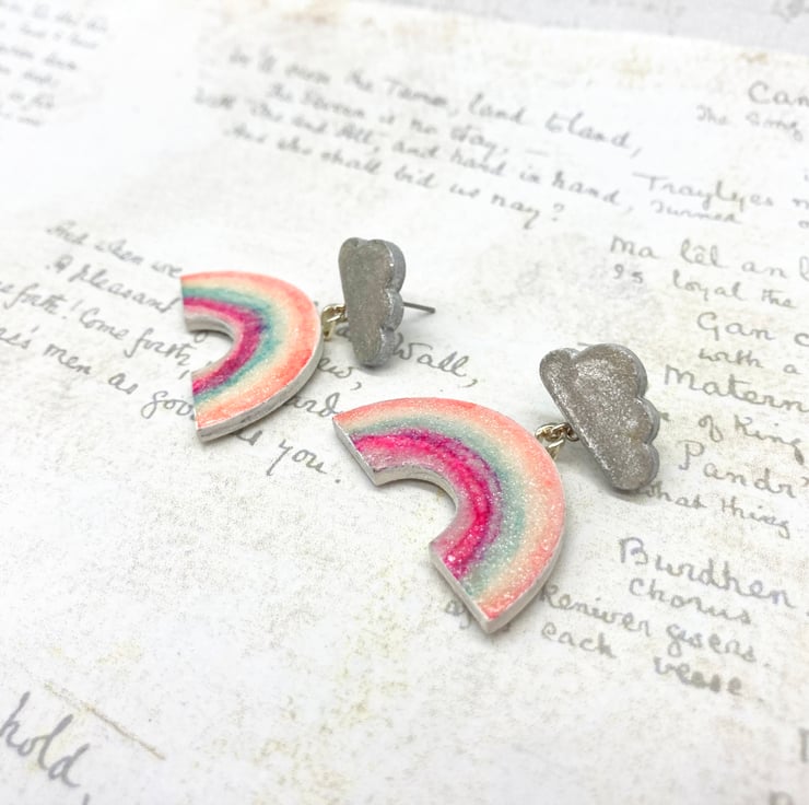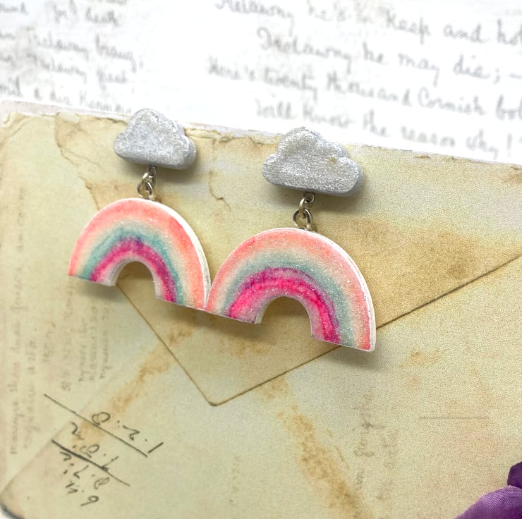 On the rainbows, I hand-coloured the stripes using artist quality watercolour pens, that paled to a pastel colour when I added the clear/mica embossing powder. I finished the back of the earrings with matching sparkle mica pigment paint and a couple of coats of acrylic varnish.