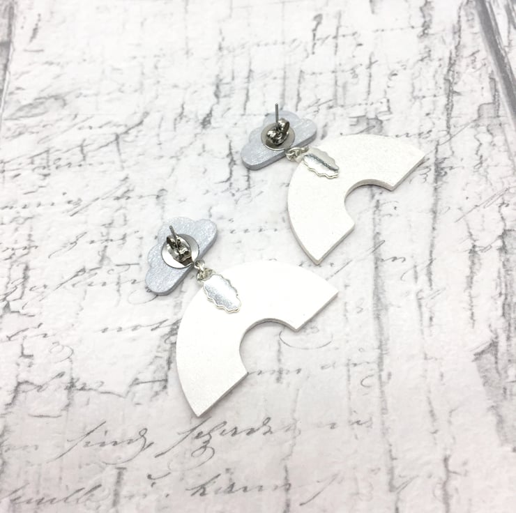 These statement earrings featuring mini wooden clouds and rainbow shapes have been created with different materials and are completely unique - even if I made another pair, they wouldn't end up completely the same!