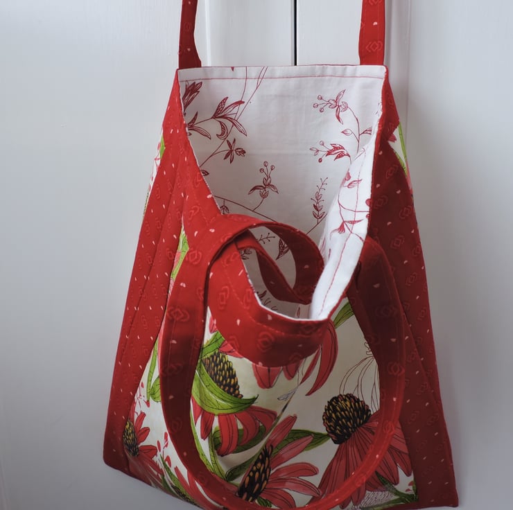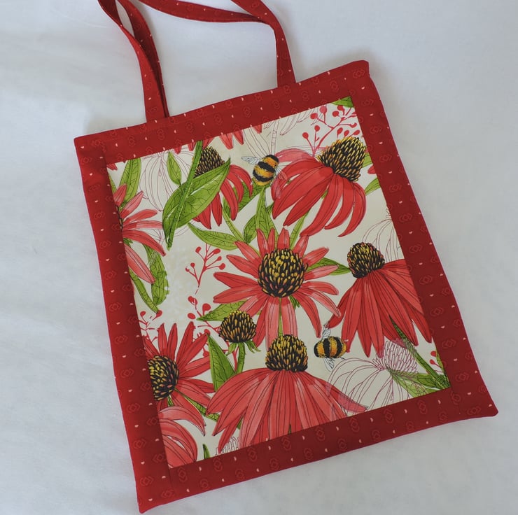 Clearance Sale now £5.00 A vibrant tote bag which has been made with a cotton fabric. Large red flowers with leaves and bees on a white background and is bordered with a red geometric cotton fabric. Lined with a white and red floral cotton fabric and has interfacing to give stability. This bag is lightweight and folds easily to fit in a pocket, bag or suitcase making it the perfect reusable tote bag.