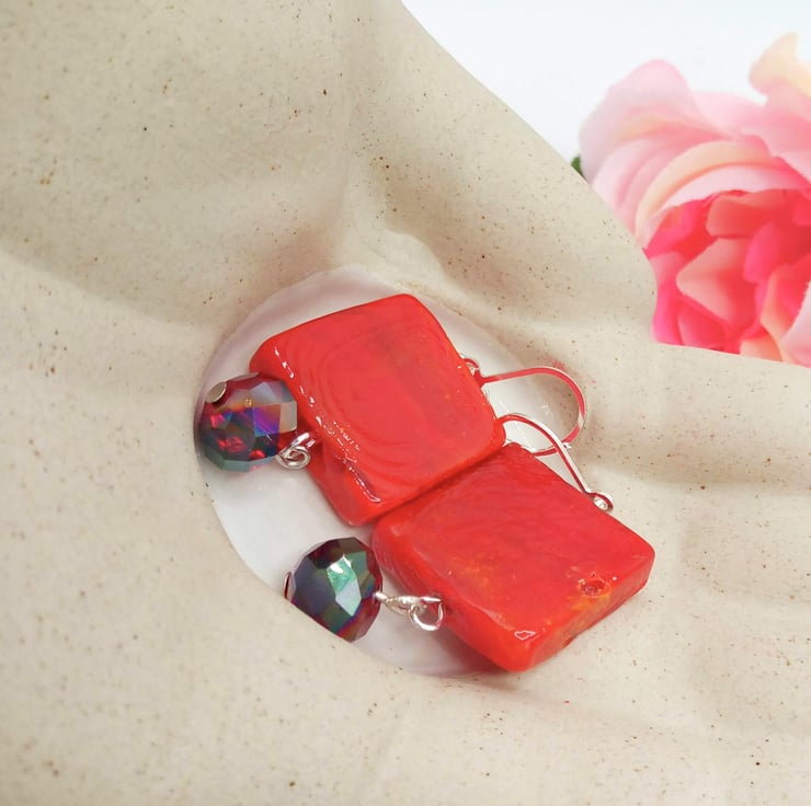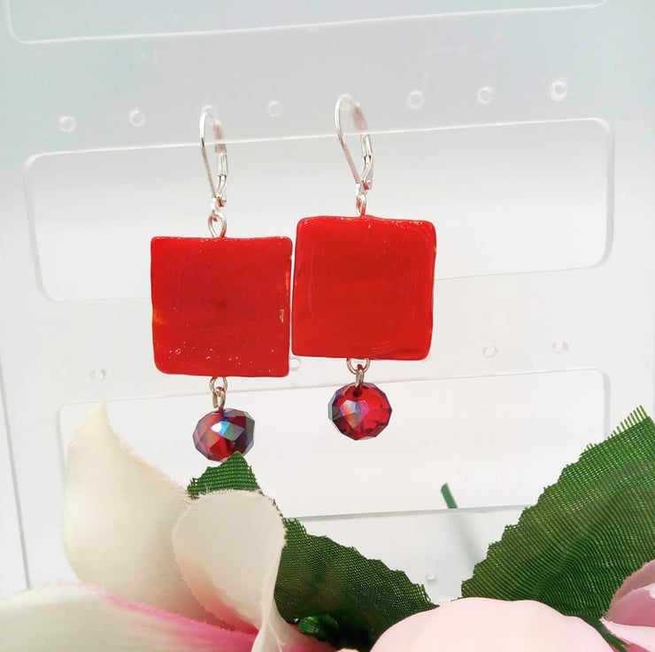 These gorgeous red earrings would add the finishing touches to any outfit you choose to wear everyday or for a casual evening out. They would make an ideal gift for a friend or relative for a birthday or anniversary, or a treat for yourself. They are made using a 20 mm red square glass bead with a deep red 10 mm x 8 mm crystal rondelle bead suspended on silver plated lever back ear wires. They have a drop of 3.2 cm from the base of the ear wires. The earrings will be dispatched wrapped in tissue paper in an organza bag and delivered to you via Royal Mail first class post.
