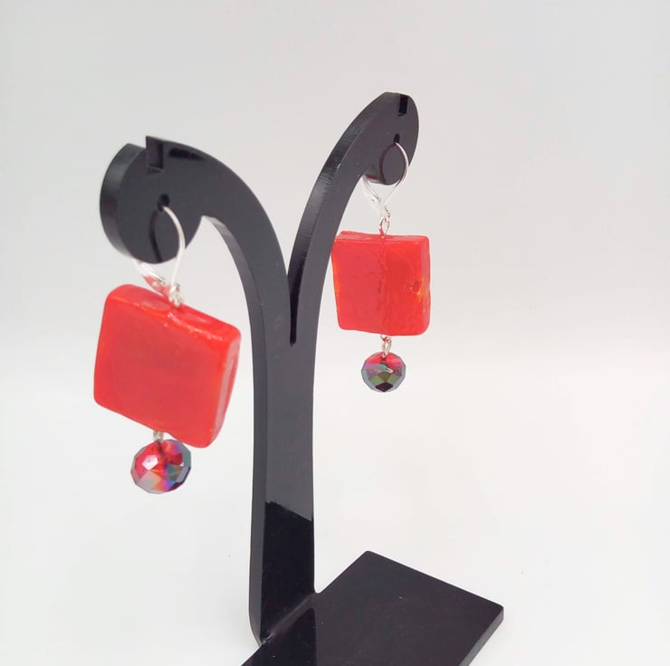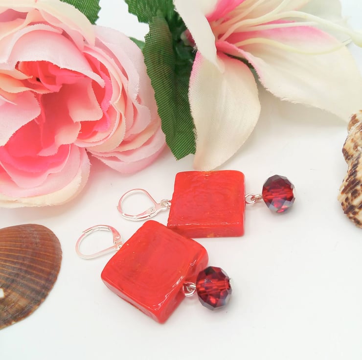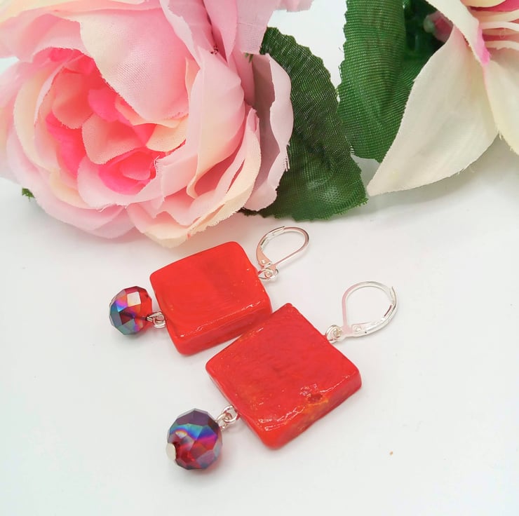 These gorgeous red earrings would add the finishing touches to any outfit you choose to wear everyday or for a casual evening out. They would make an ideal gift for a friend or relative for a birthday or anniversary, or a treat for yourself. They are made using a 20 mm red square glass bead with a deep red 10 mm x 8 mm crystal rondelle bead suspended on silver plated lever back ear wires. They have a drop of 3.2 cm from the base of the ear wires. The earrings will be dispatched wrapped in tissue paper in an organza bag and delivered to you via Royal Mail first class post.