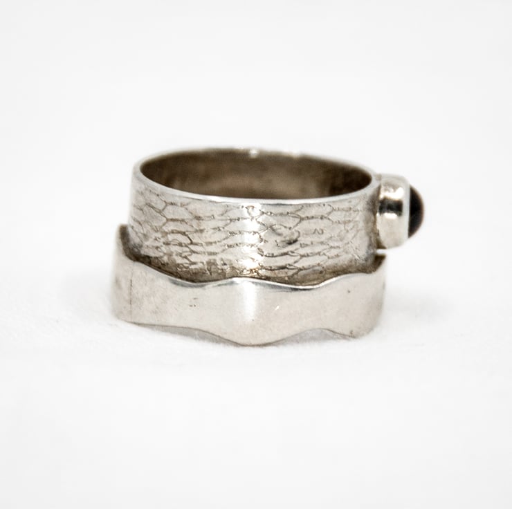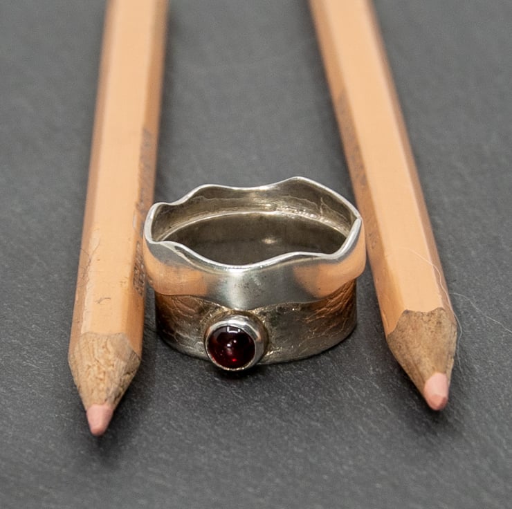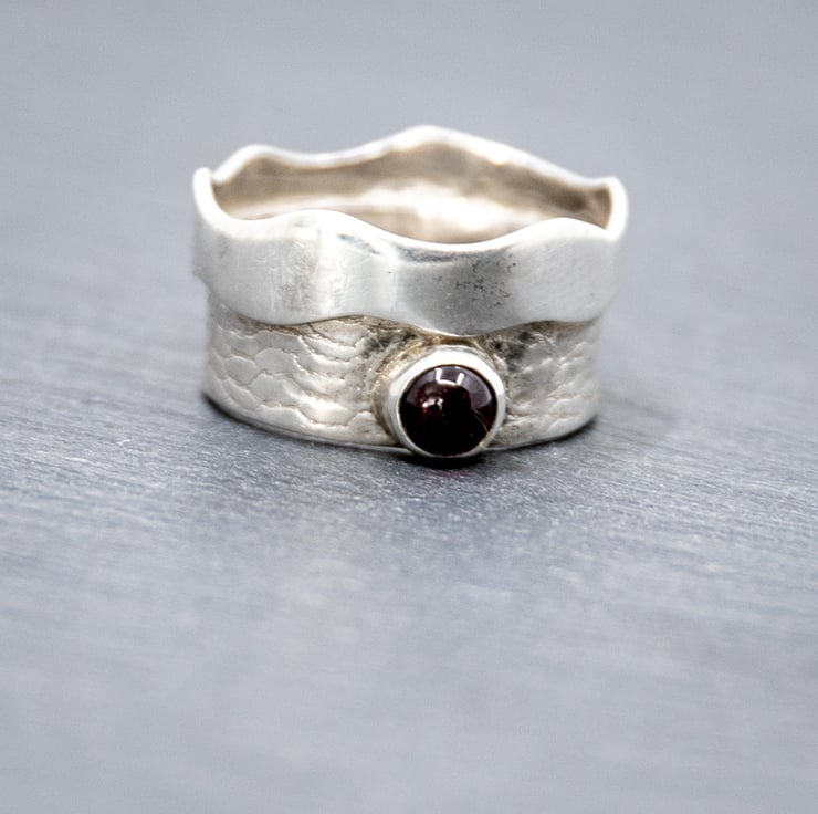 This handmade sterling silver ring is actually two rings soldered together. One is a plain ring with a wavy edge whilst the other ring has a wavy pattern on it and a Garnet, bazel set, on it.