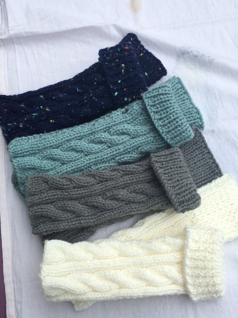 These cosy hand and wrist warmers are knitted in Marriners Duck Egg Aran. They measure a generous 10” and give good wrist and finger coverage. The ribbed top can be doubled back or kept straight to give more finger coverage depending on hand size. Bought last year by posties and van drivers, cyclists and dog walkers, paper deliverers and walkers, they have proved to be warm and versatile and great for wearing when you need fingers and thumb free. Also bought last year as unusual gifts for friends and relatives.