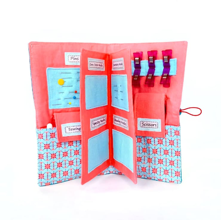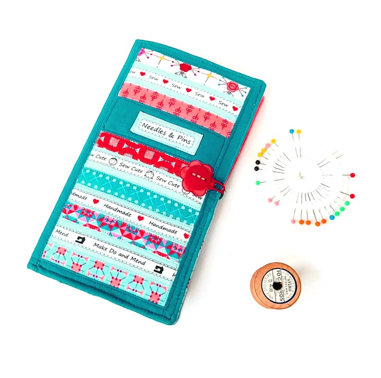 This is a fun project suitable for those with some patchwork / quilting experience. The finished needle book would be ideal for sewers / quilters who like to be organised and have easy access to their sewing notions, includes space to store 8 different needle types, a pin pad, a pouch to store packs of sewing machine needles, quick unpicks etc., an embroidery scissor's pouch, spaces for glue / marking pens and a nice neat little sewing clips port (these can be awkward to store so nice to have them to hand in a needle book).