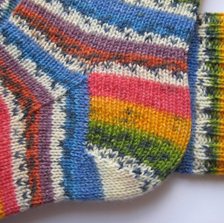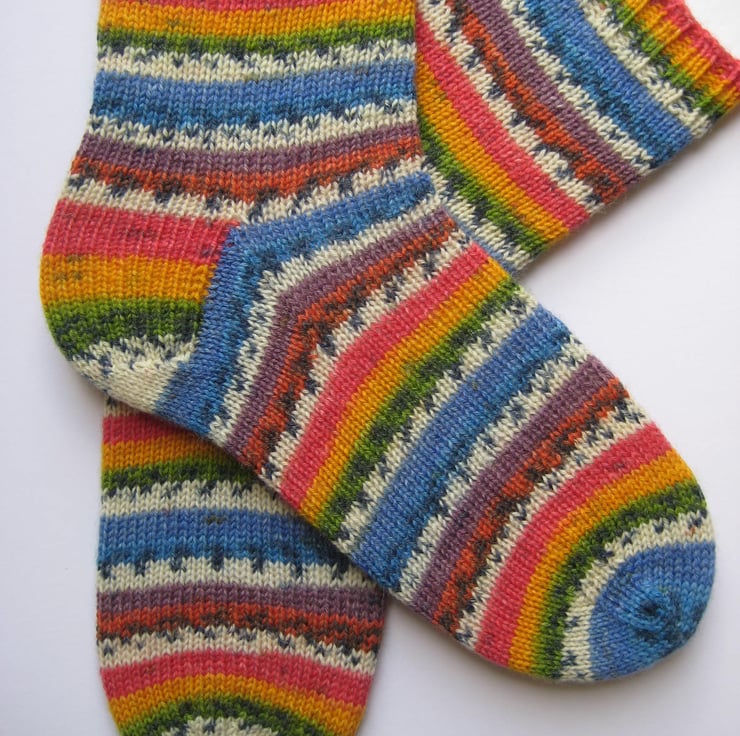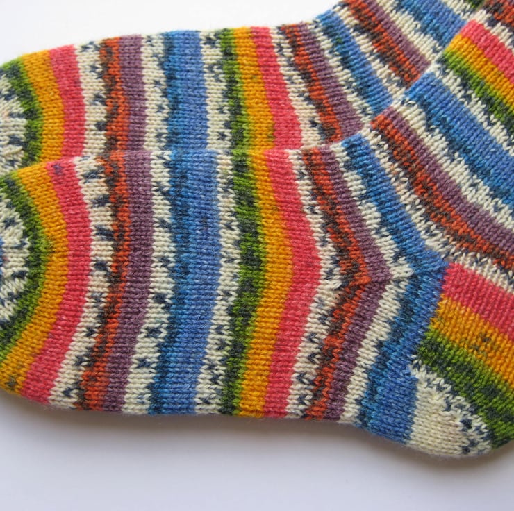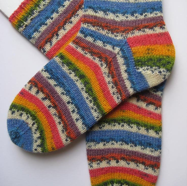 Hand knitted in the round on 5 double pointed needles (by me, not a machine), these wool socks are made from Opal 4 ply self patterning sock yarn. Made from 75% wool 25% polyamide yarn in shades of yellow, orange, blue, green and cream.