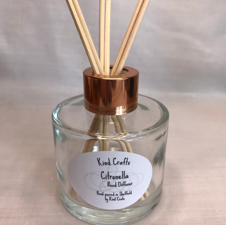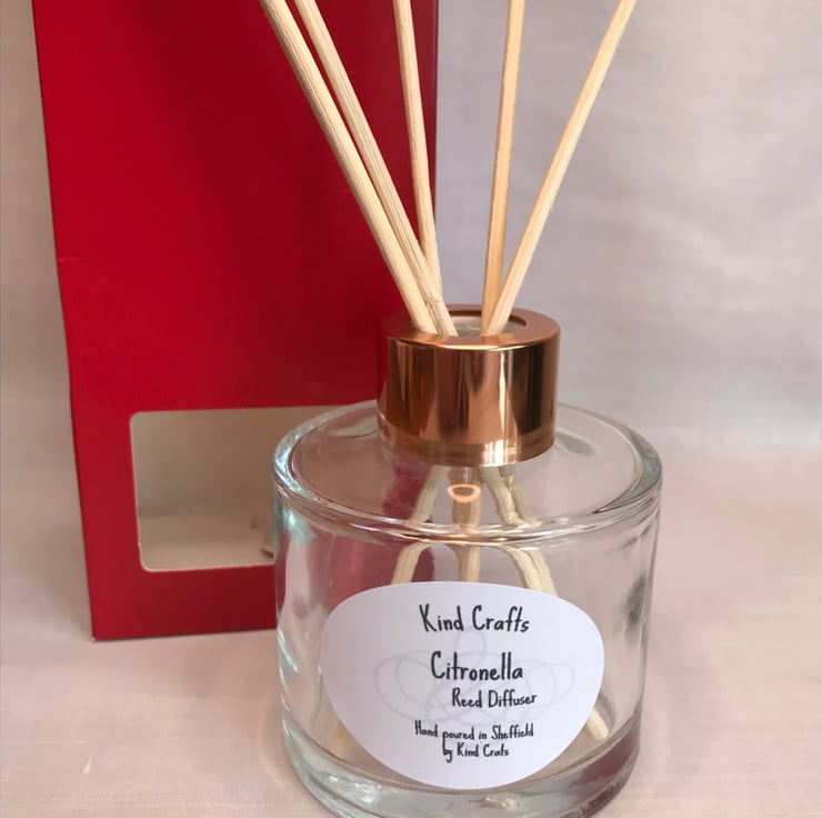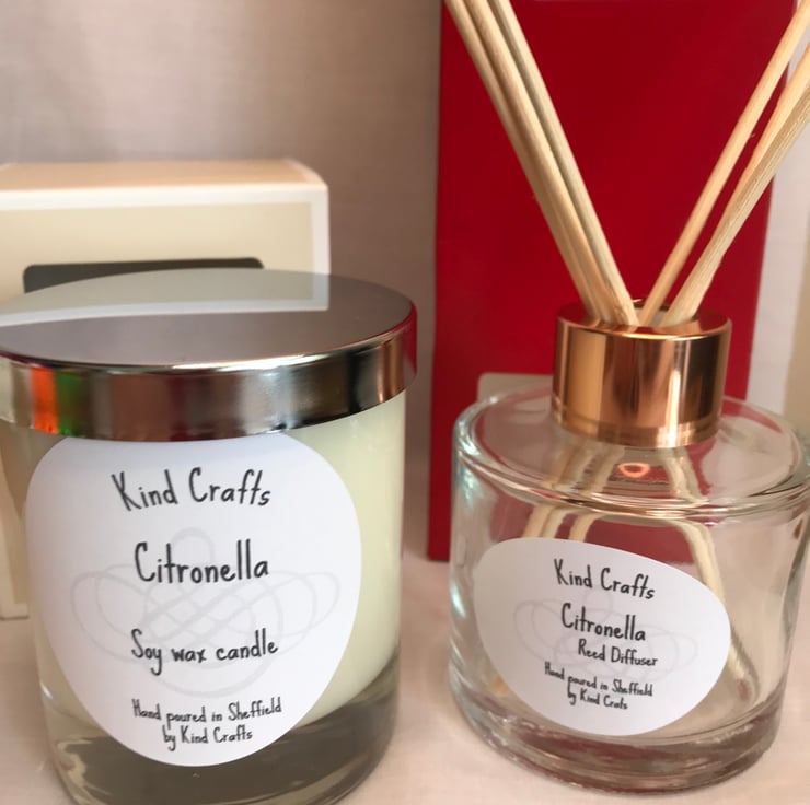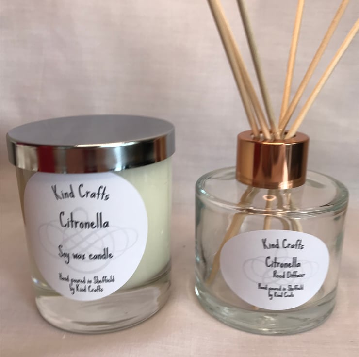 The soy candle and reed diffuser are both scented with citronella essential oil a sweet, lemony scent,