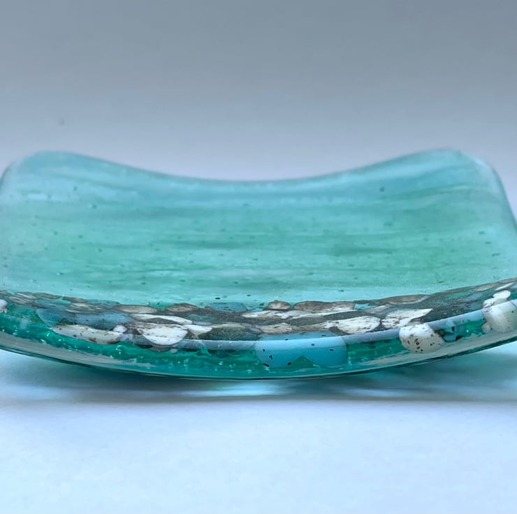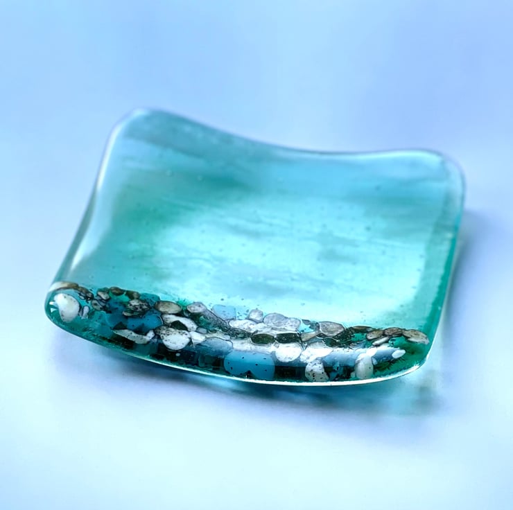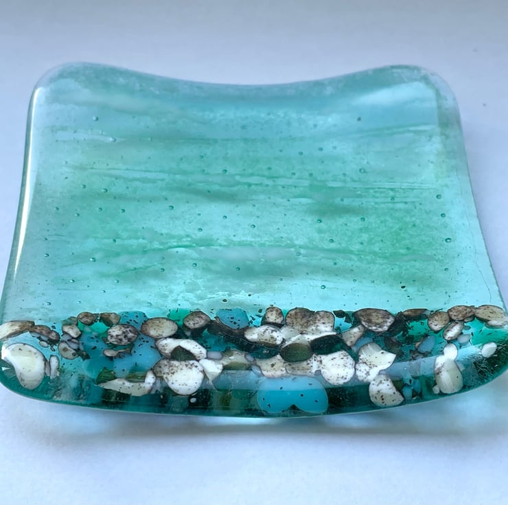 Beautiful aqua blue seascape cute little handmade fused glass trinket dish. Pebble affect beach which is created using glass pieces that react in the kiln, when fused together. The dish measures approx 12cm square. The photos don’t do the dish justice.