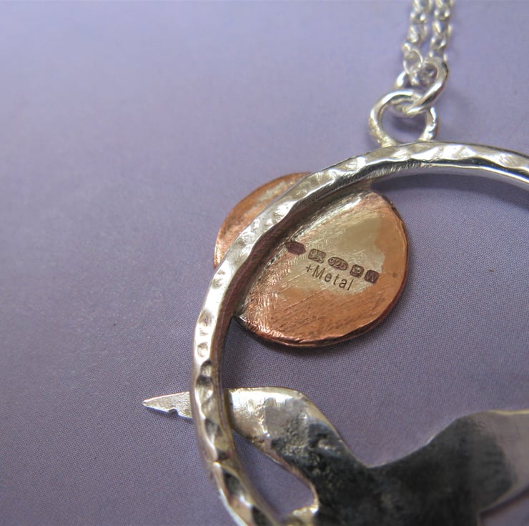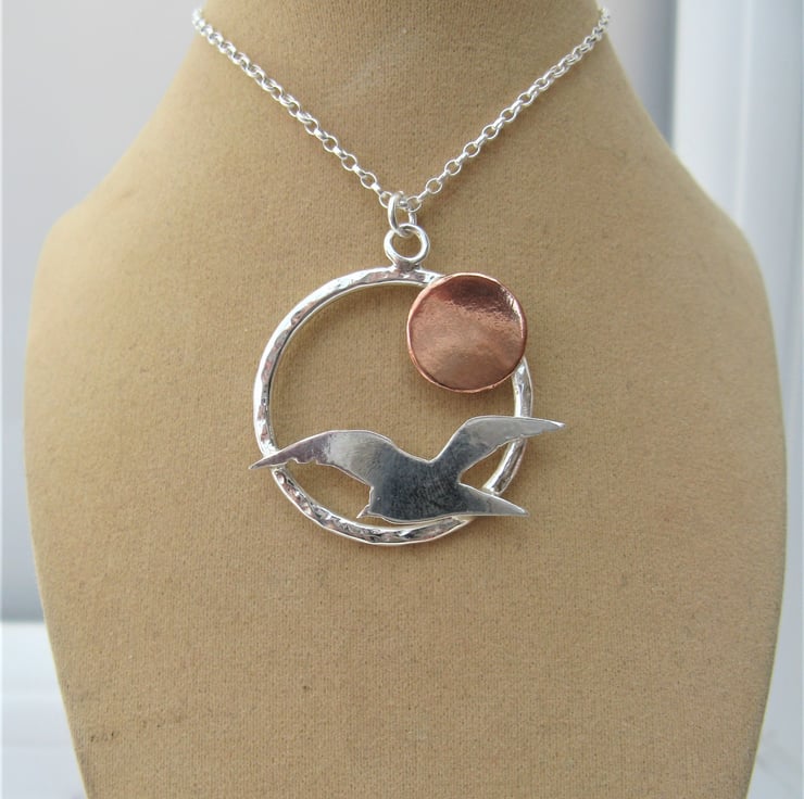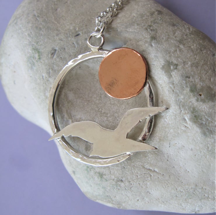This unique necklace includes a beautiful seagull silhouette hand cut from sterling silver sheet, alongside a copper sun / moon.