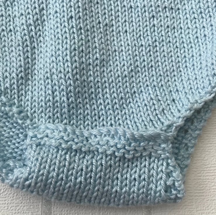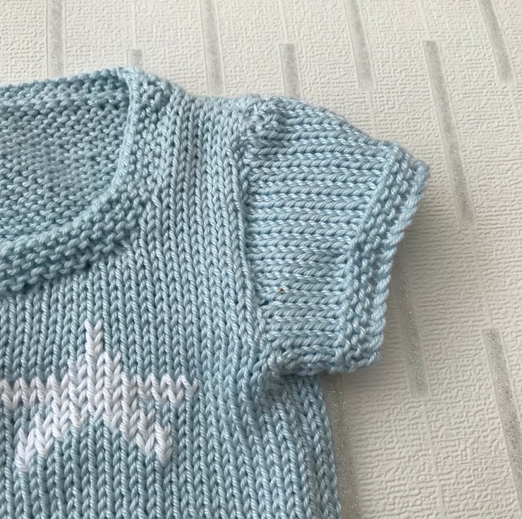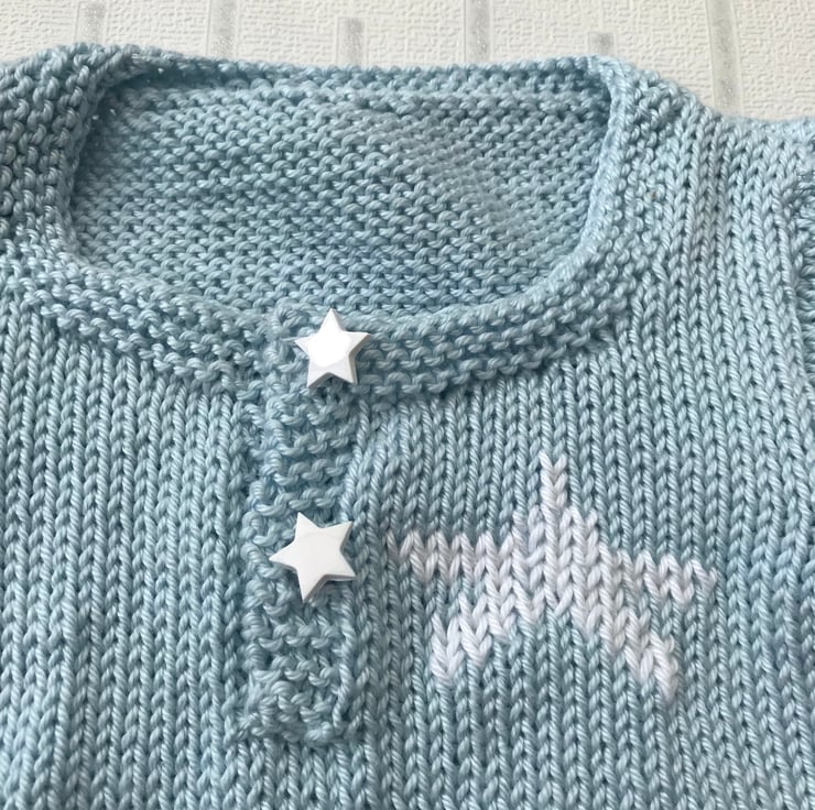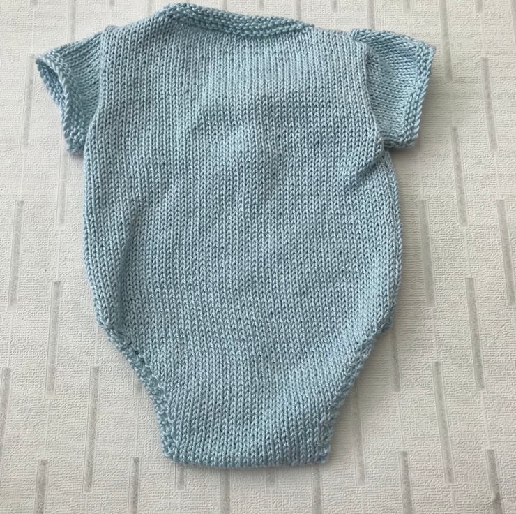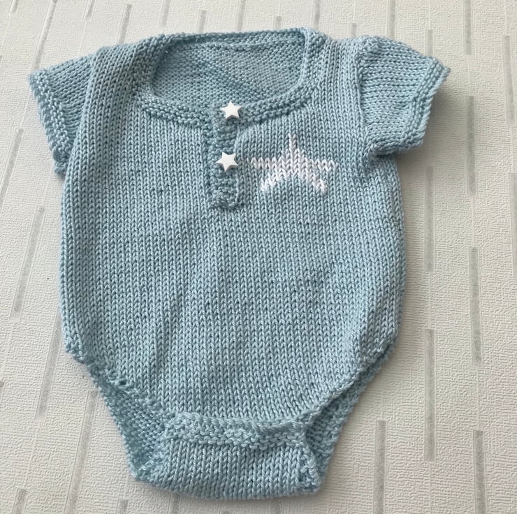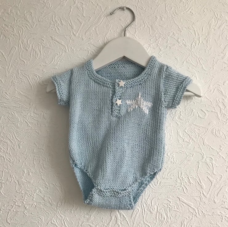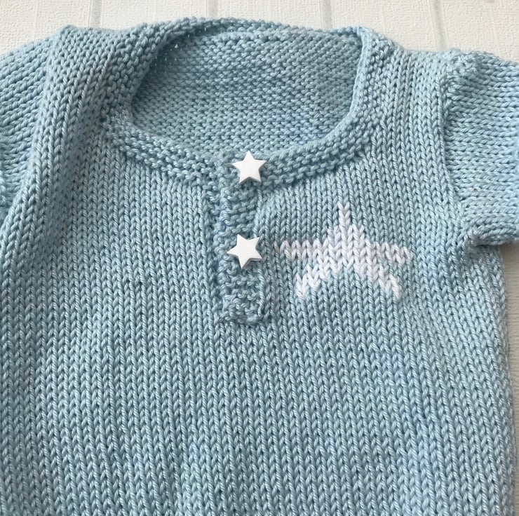 A hand knitted short sleeve babygro worked in a powder blue 100% cotton yarn. It has a white star detail at the top of the left front and star shaped buttons covering the poppers on the front opening. It fastens at the bottom with three poppers.