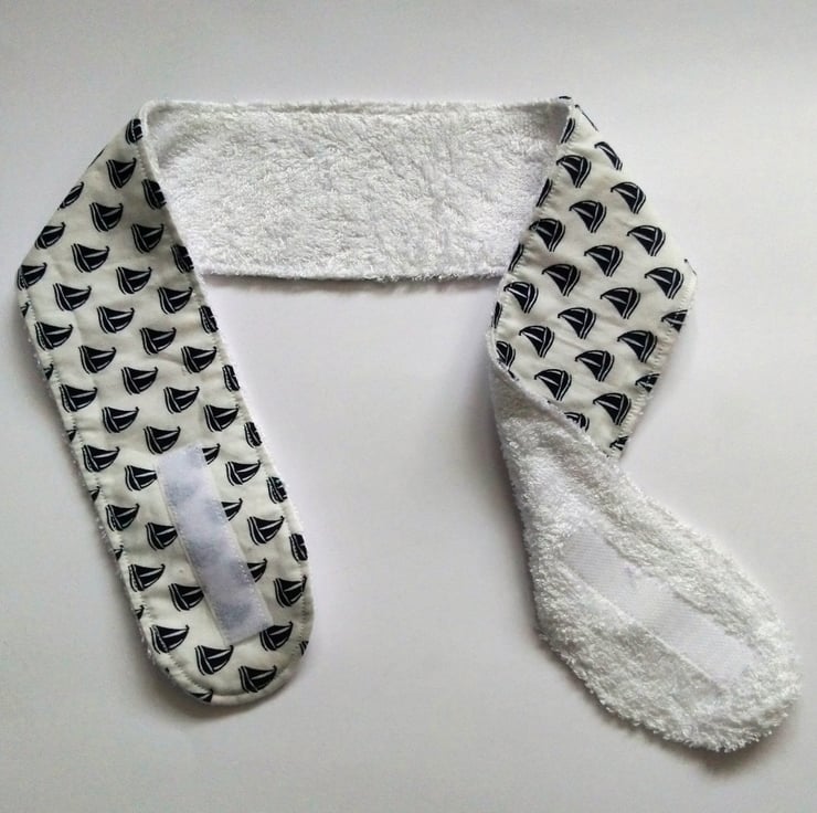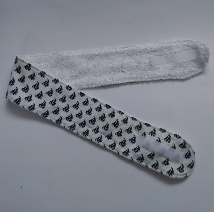 This headband has a bottom layer of soft white bamboo towelling fabric and a top layer of cotton fabric with a boat design on a whitebackground. It is easily adjustable with Velcro fastenings.