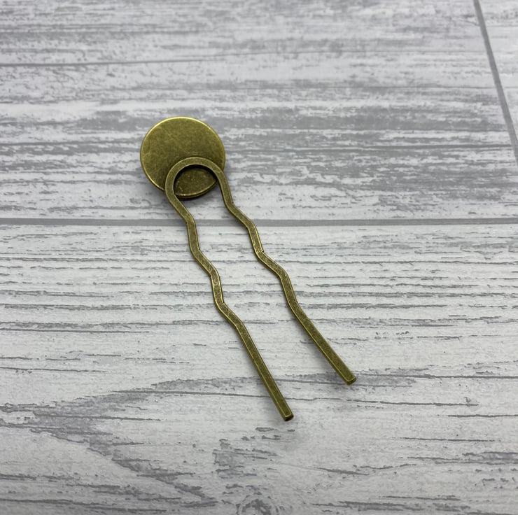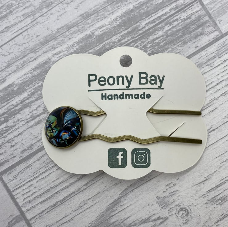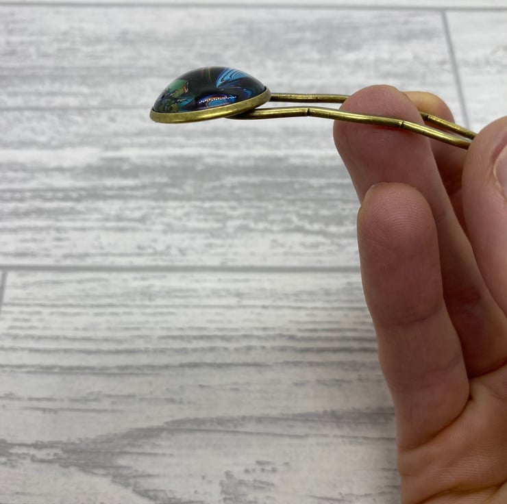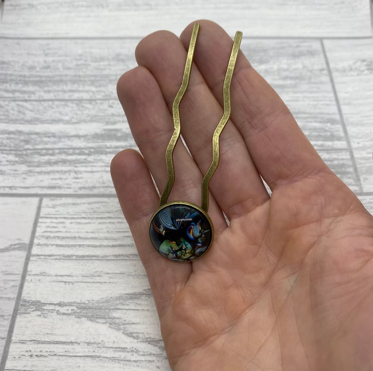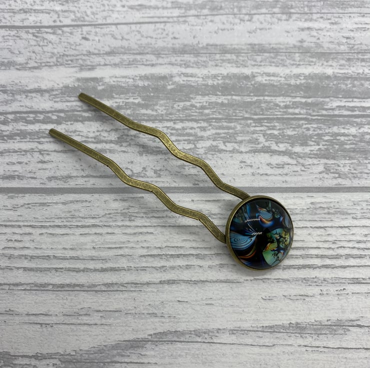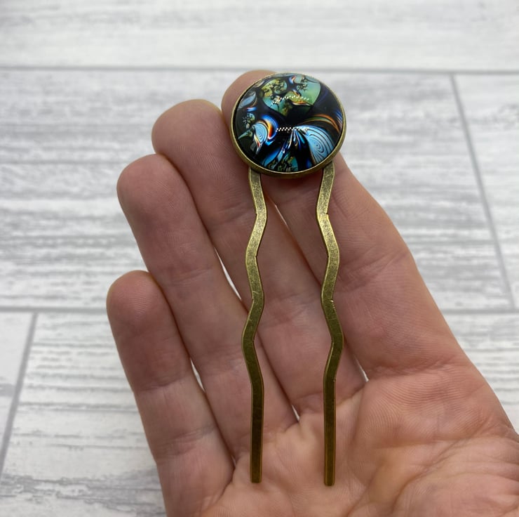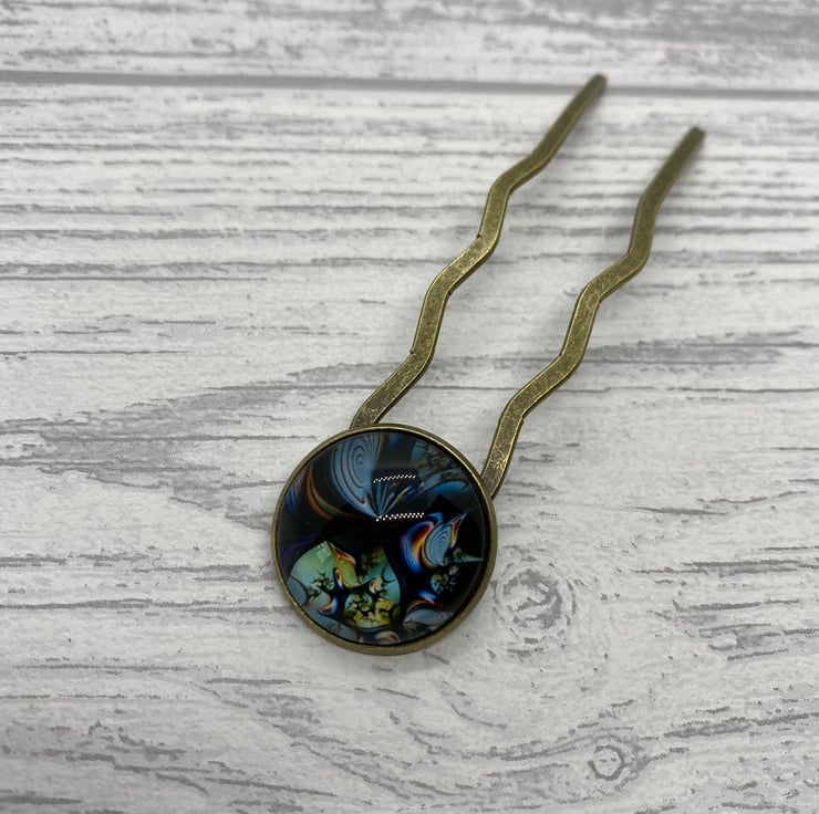 This is a beautiful bronze tone hair fork with an abstract print sealed under a glass dome. The colour of the print is predominantly blue, green and browns, with a black background.