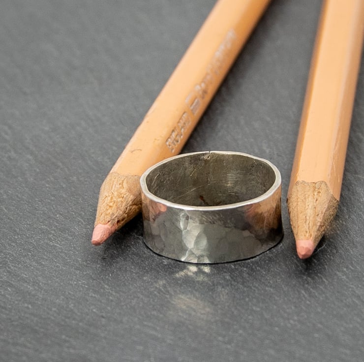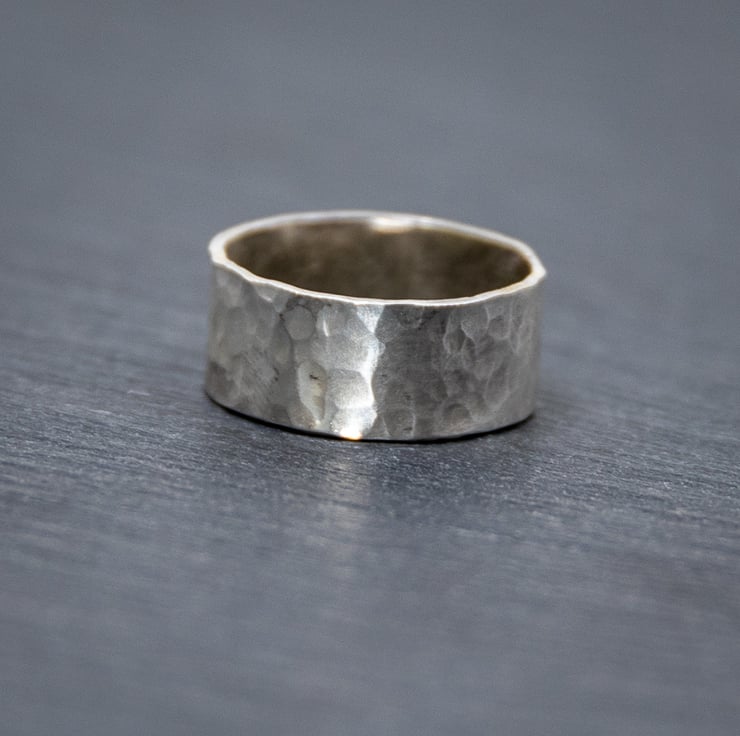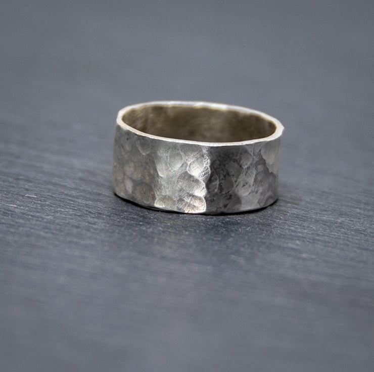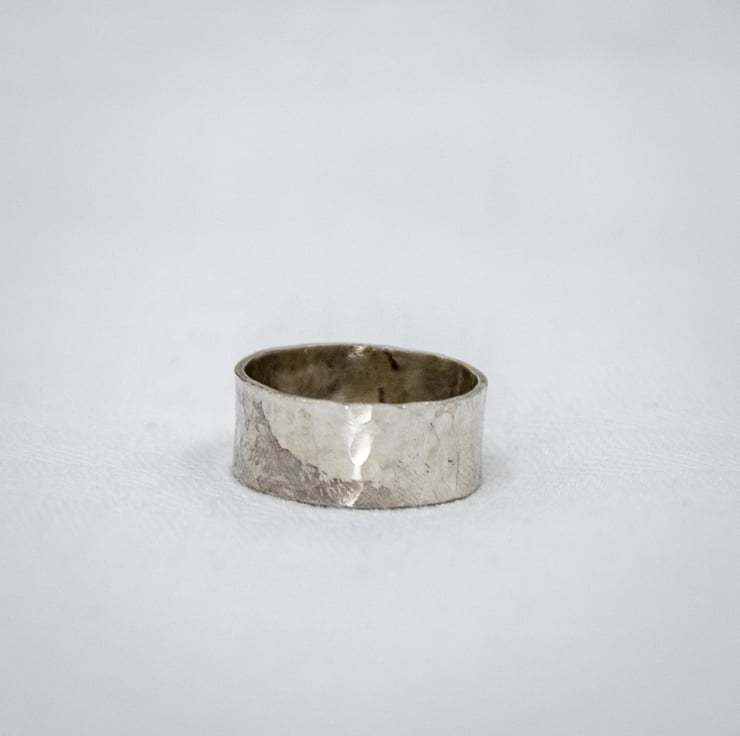 Hand made using sterling silver sheet, this ring has a simple hammered finish to it.