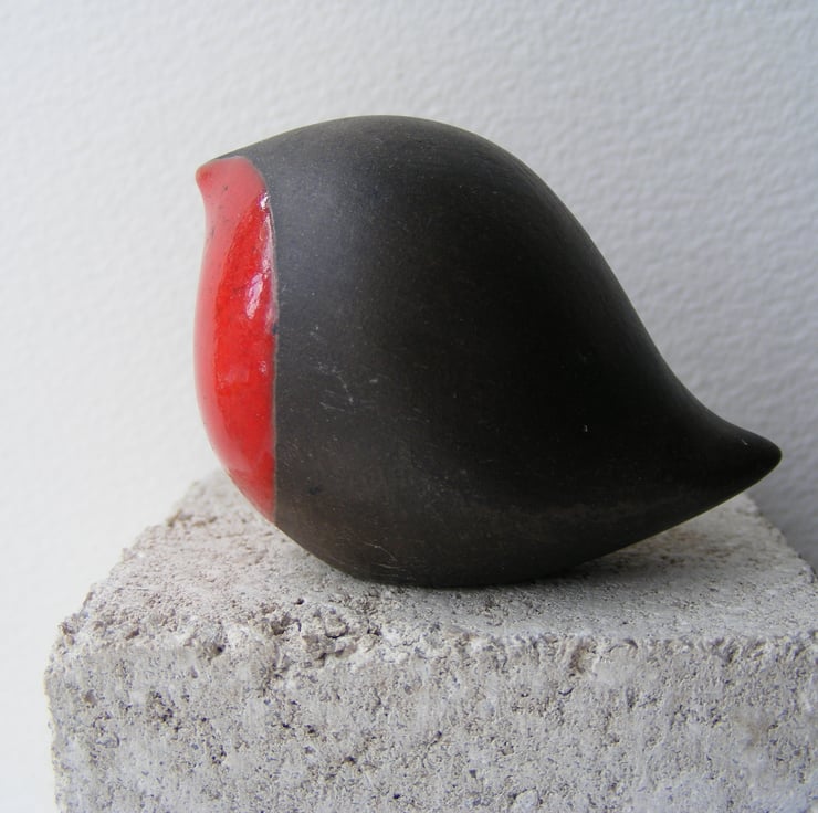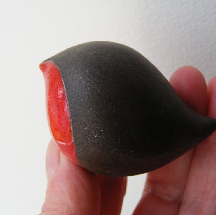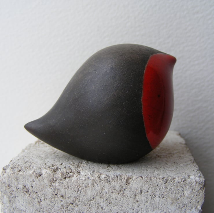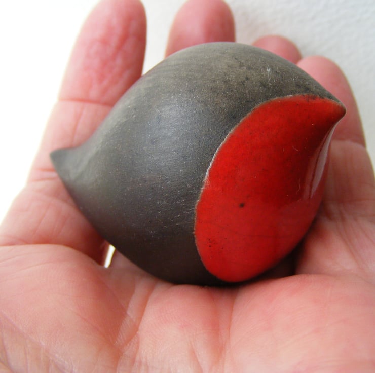 This little robin is hand made and measures approx, 3.8cm high and 5.4cm long. It is made from white earthenware clay and fired first in an electric kiln then the red glaze is painted on the breast and it is raku fired in a gas kiln, the dark part of the bird is unglazed so comes out a black/greyish colour after being smoked in sawdust, sometimes it has sawdust shadows smoked on to the surface. It is then washed, lightly sanded and polished with beeswax.