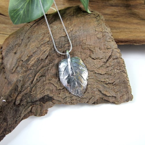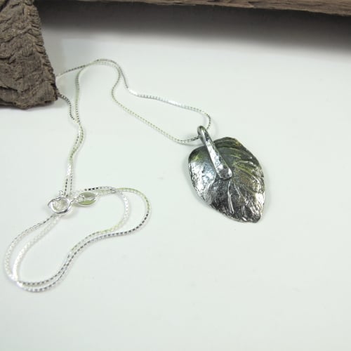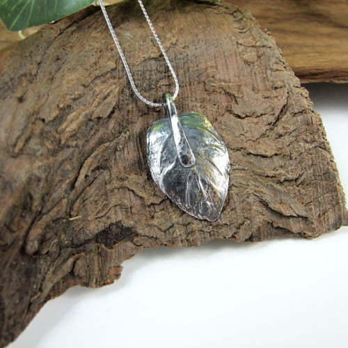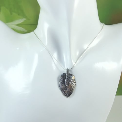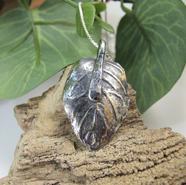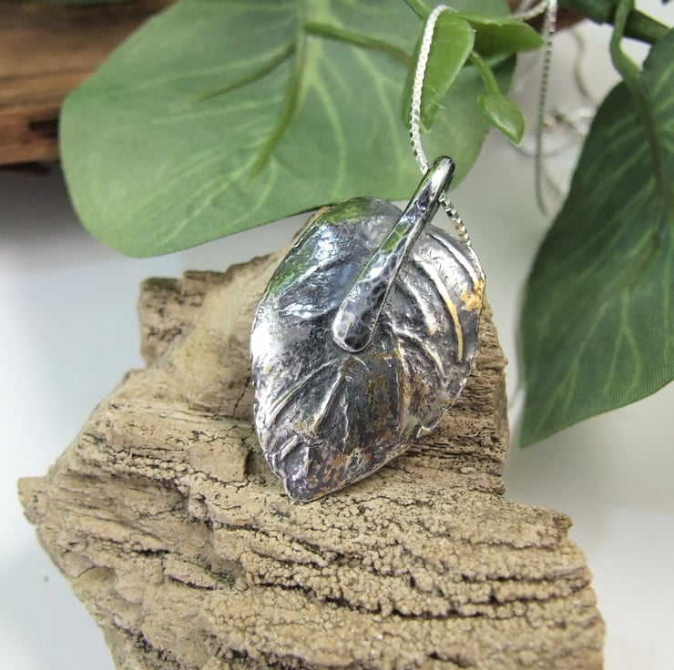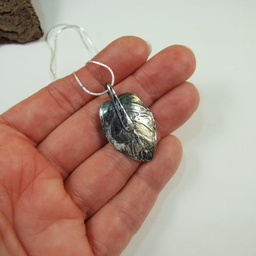 I have created the leaf using fine silver clay which has been textured using a leaf. Fine Silver Clay is an eco-friendly product made from fine silver particles suspended in a carrier, the carrier burns off durig firing in a kiln leaving .999 pure silver. Once the leaf was fired I added some 24ct gold leaf using my blow torch and burnished it in place then gave the whole piece an oxidsed finish.