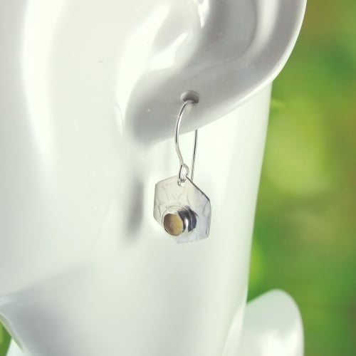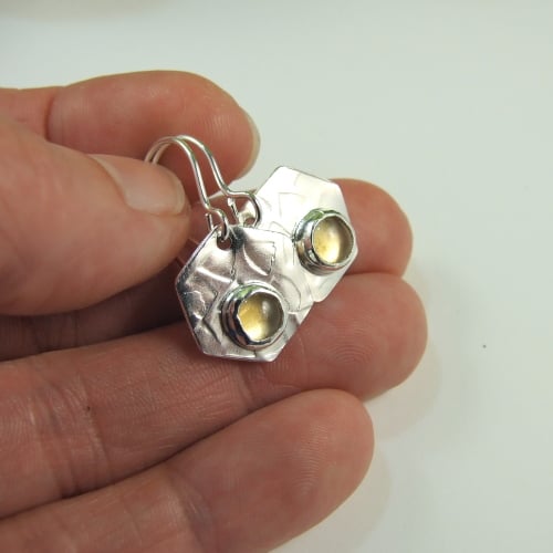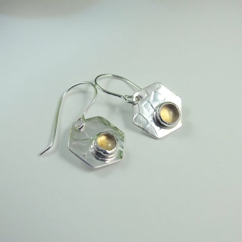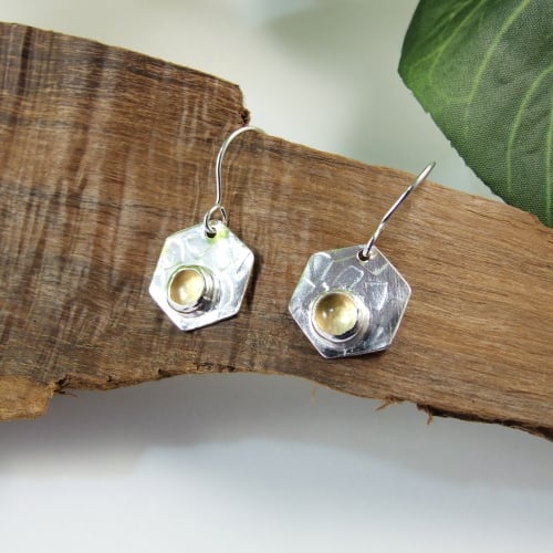 Silver Hexagon dropper earrings, hand crafted from sterling silver sheet, cut by hand and textured. At the centre of the earrings sits a 5mm Citrine cabachon set in sterling silver. Fitted to handcrafted sterling silver earwires.