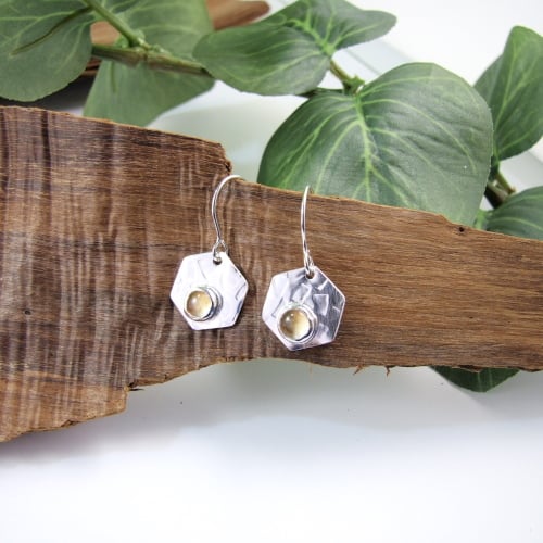 Hexagon Earrings with Citrine Gemstones. Handcrafted Textured Sterling Silver Hexagon Shaped Earrings.