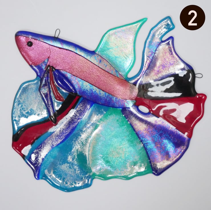 This fused glass siamese fighting fish is made from blue, red and purple glass. With a shimmering metallic sheen the piece works equally well against a wall or as an indoor / outdoor sun catcher.