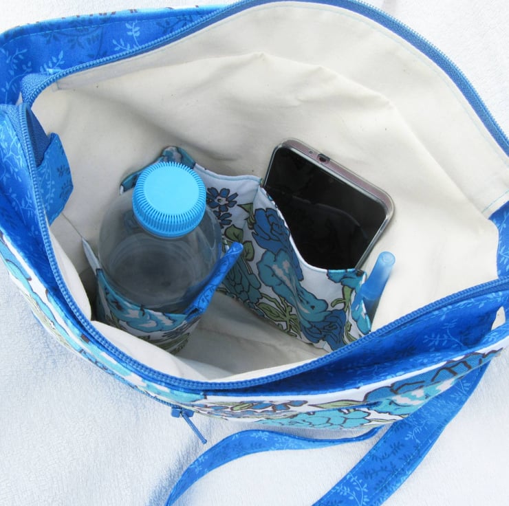 The outside of the bag is made entirely from quilting weight cotton fabrics. The lining is 100% cotton unbleached calico. Between the outer bag and lining are layers of fine fleece and woven interlining which give the bag structure - it can stand unsupported - whilst keeping it soft and easy to wear.