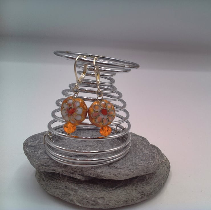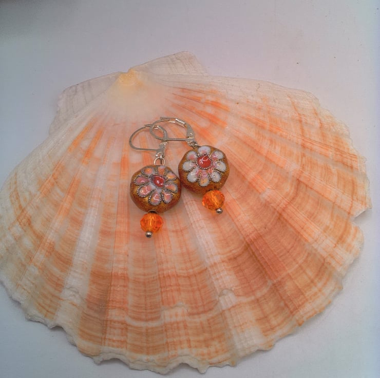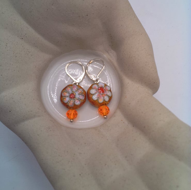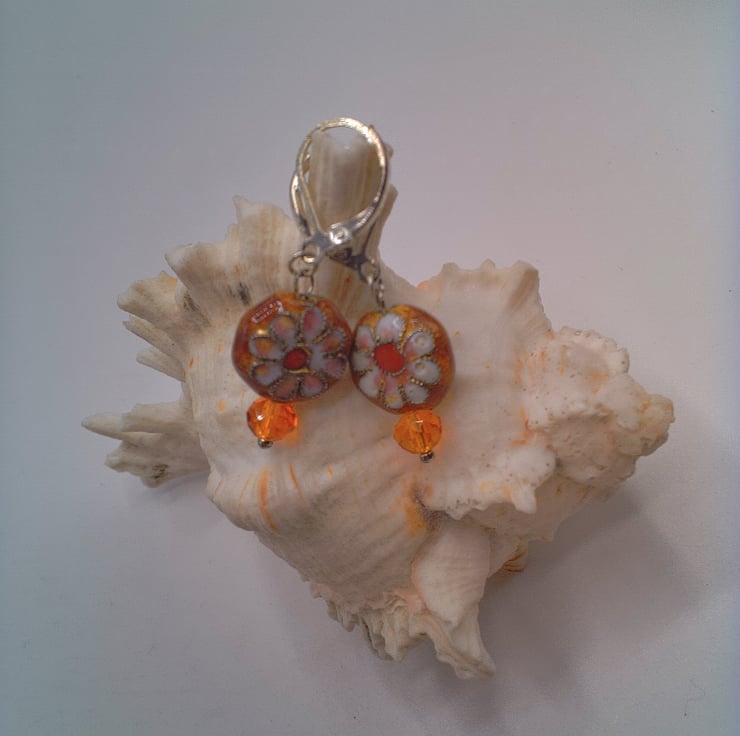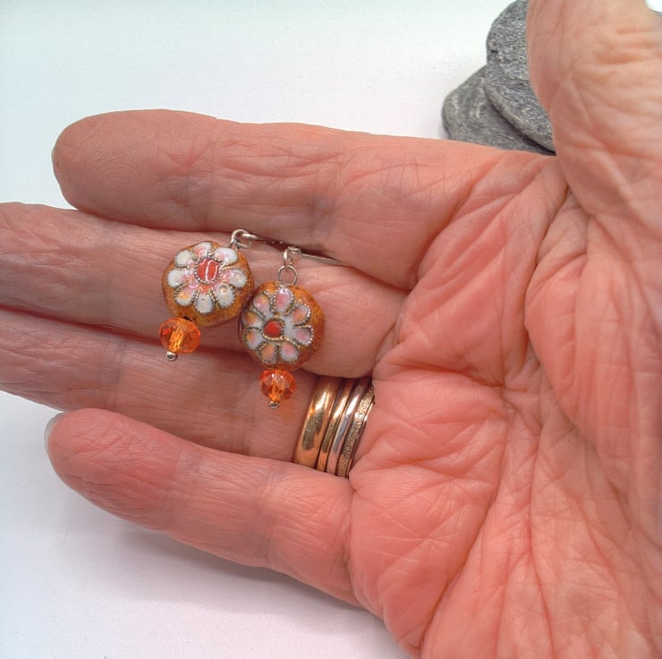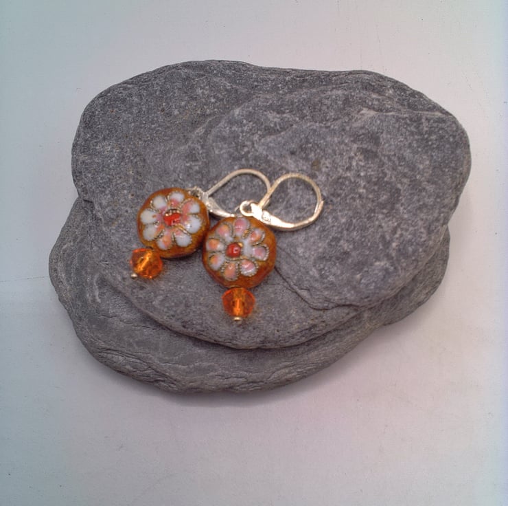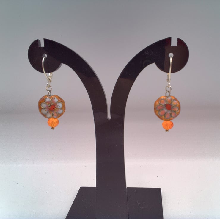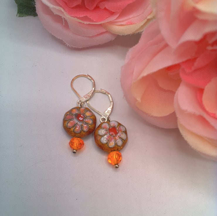 These pretty cloisonne and crystal earrings would look great with any outfit you wear everyday or for an evening out. They would make a perfect gift for a friend or relative for a birthday or anniversary, or a treat for yourself. The earrings are made using two orangey brown 12 mm cushion beads with a white and red floral pattern and two 4 mm or 6 mm orange crystal rondelle beads. They are suspended on silver plated ear wires and they have a drop of 2 cm from the base of the lever backs. The earrings will be dispatched wrapped in tissue paper in an organza bag and delivered via Royal Mail first class post.