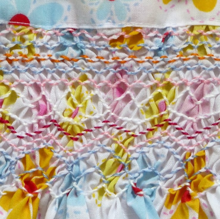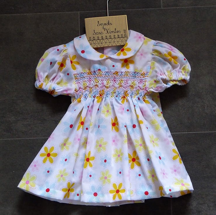 Hand embroidered smocked dress, made in polycotton. Contemporary multi coloured flower design on a fresh white background. Elasticated puffed short sleeve.