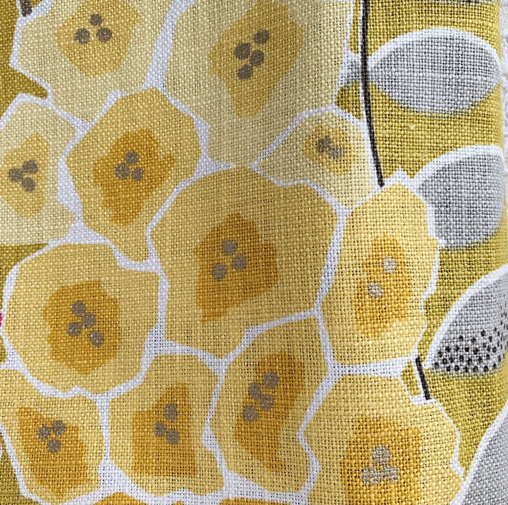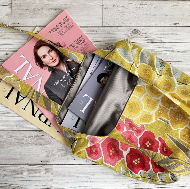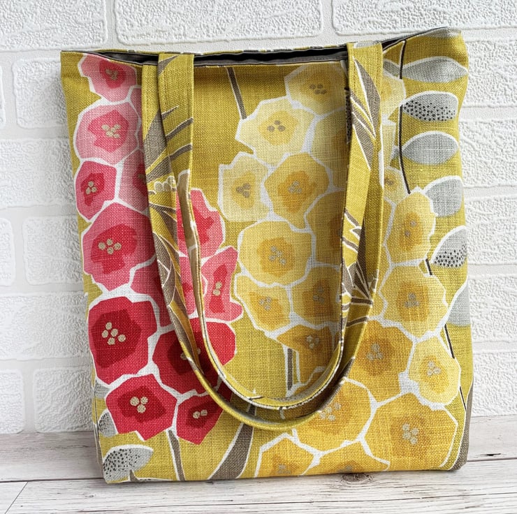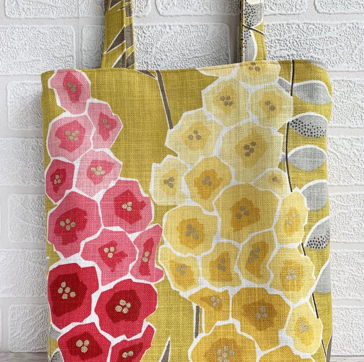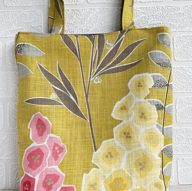 Floral tote bag in Delphinia fabric. This pretty tote bag is made from gorgeous Harlequin Delphinia linen and viscose fabric. The pretty floral print features two large spires of stylised delphinium-type flowers on a lovely mustard coloured background. One spire is in shades of yellow and the other in shades of pink. Both have white edges and lovely shiny gold spots in the centre of each flower. There are also stems of leaves in shades of light and dark grey. The bag is lined with lovely grey satin to match the colour of the leaves.