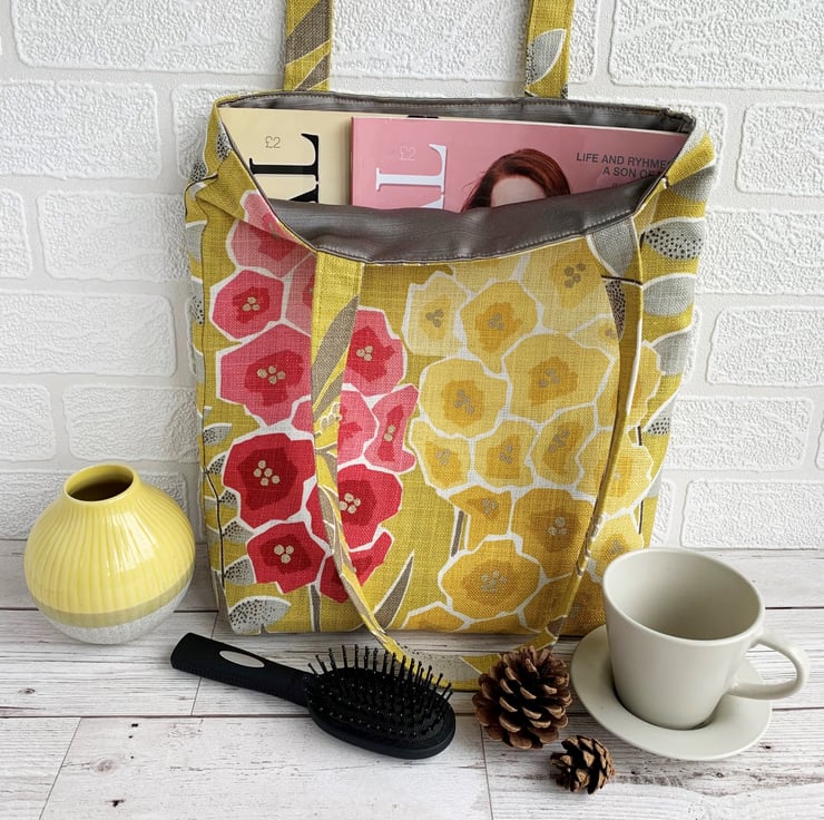 Floral tote bag in Delphinia fabric. This pretty tote bag is made from gorgeous Harlequin Delphinia linen and viscose fabric. The pretty floral print features two large spires of stylised delphinium-type flowers on a lovely mustard coloured background. One spire is in shades of yellow and the other in shades of pink. Both have white edges and lovely shiny gold spots in the centre of each flower. There are also stems of leaves in shades of light and dark grey. The bag is lined with lovely grey satin to match the colour of the leaves.