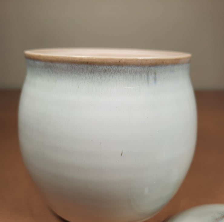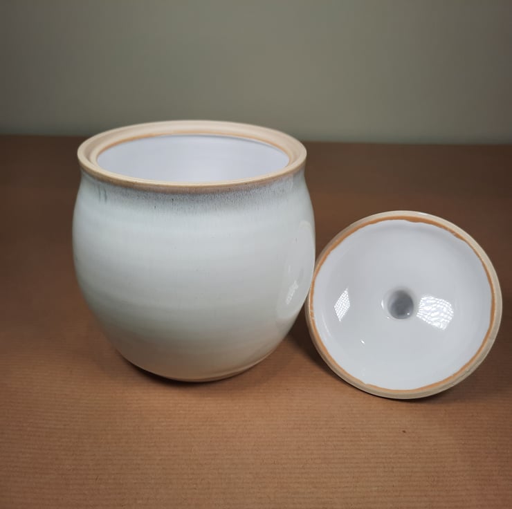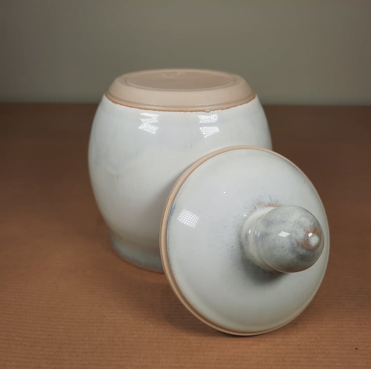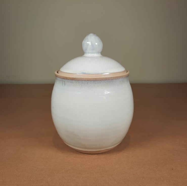 A hand thrown ceramic storage jar with an off white glossy glaze on the inside and out. On the outside the white has subtle blues/brown around the knob and rim.