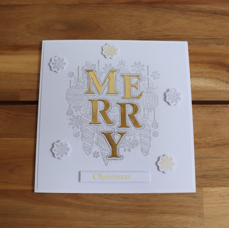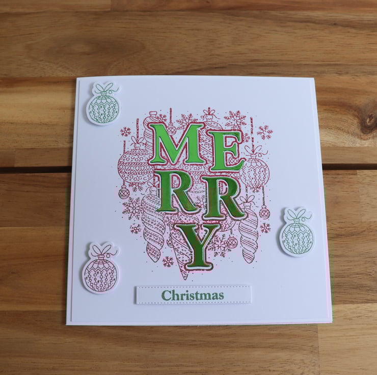 The background is stamped with Christmas baubles, and then decorated with baubles snowflakes, and Christmas stockings, the sentiment on the front is Merry Christmas.