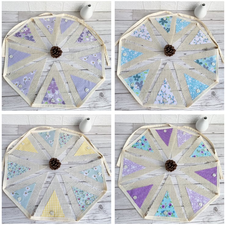 This shabby chic, rustic bunting, with its lovely cream hessian and pretty florals, would be ideal for parties, weddings, barbeques, or just to add a pretty touch to your décor.