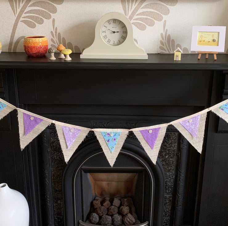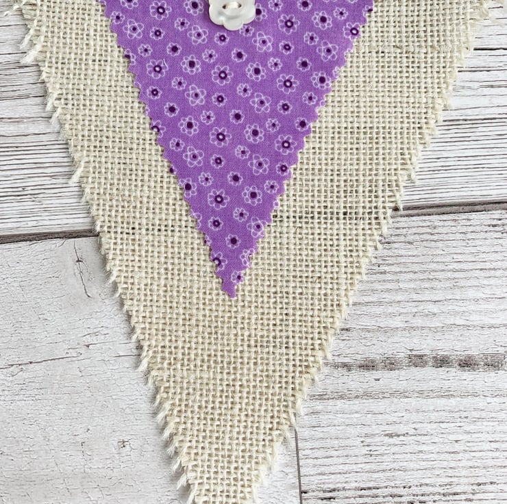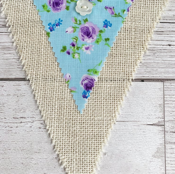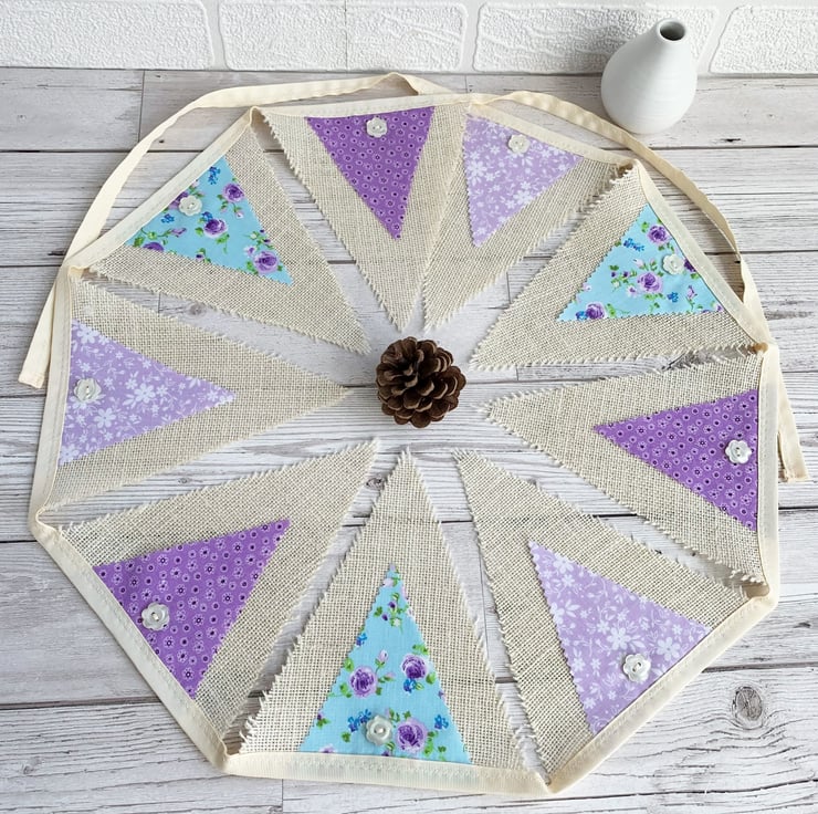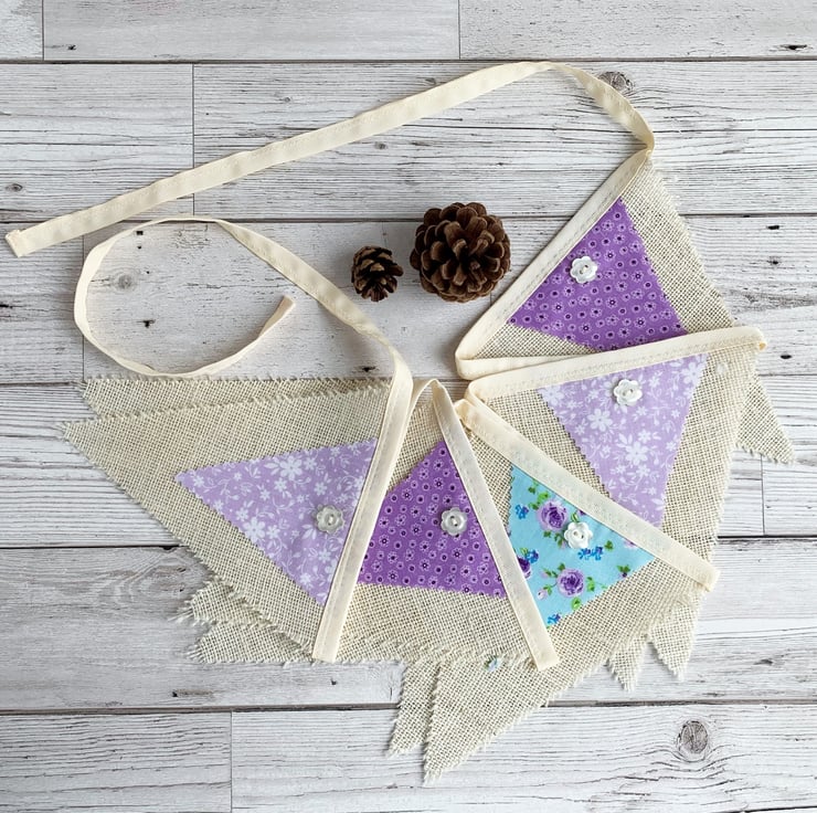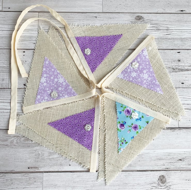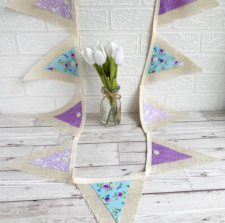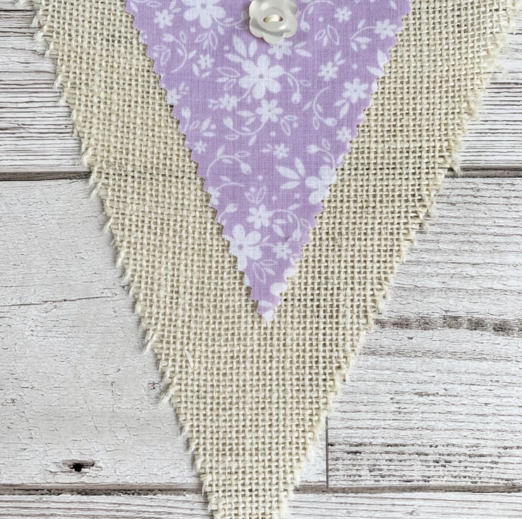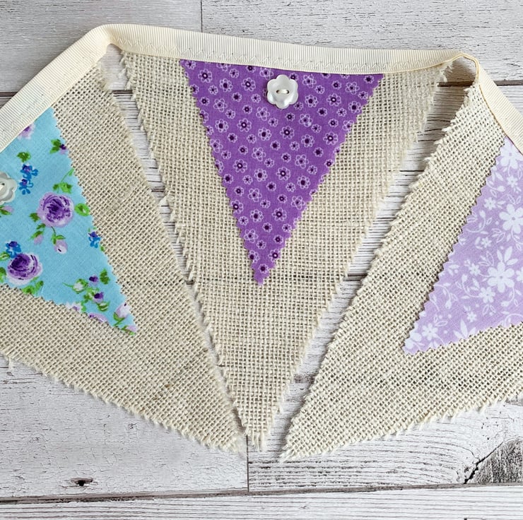 Cream hessian and mauve floral print fabric bunting. This rustic, decorative bunting is made up of nine flags. Each of the flags consists of a lovely floral print fabric flag laid on top of a larger cream hessian flag, and embellished with a flower-shaped button in pretty pearlescent cream. There are three co-ordinating floral fabrics in gorgeous shades of mauve, purple, lilac, pale blue, white and green. I've edged the floral fabric with pinking shears, and left raw edges on the cream hessian, which gives a lovely shabby chic, rustic effect. The flags are strung on a length of cream grosgrain ribbon to match the cream hessian.