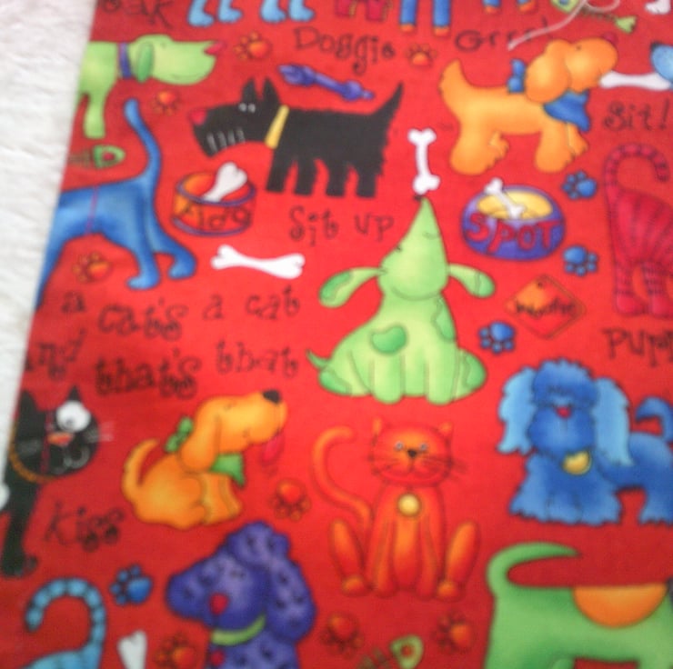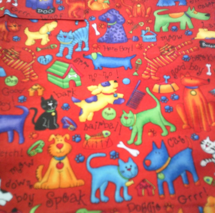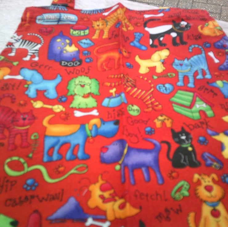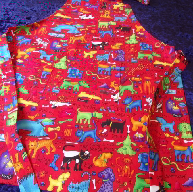The design on fabric used for this apron is of brightly coloured cats and dogs in blue, green, orange, purple and yellow on a bright red background.