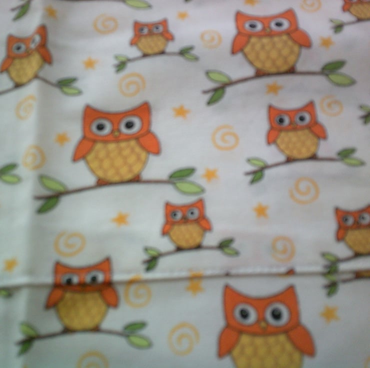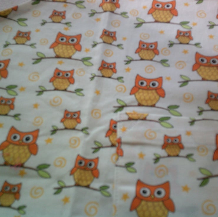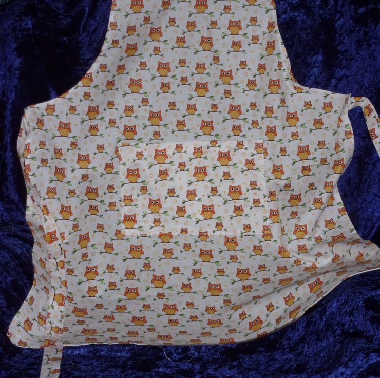 The design on the fabric used for this apron is of owls on branches on a cream background