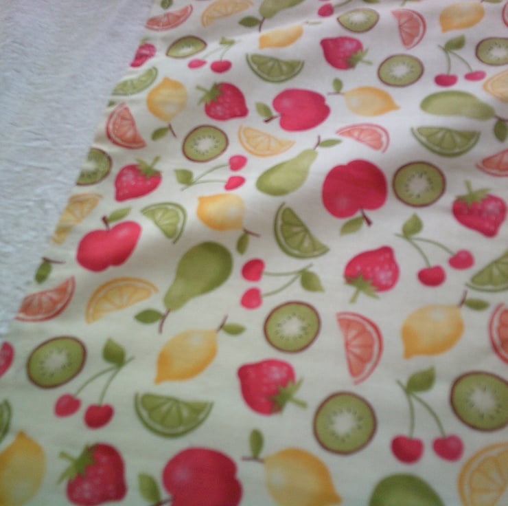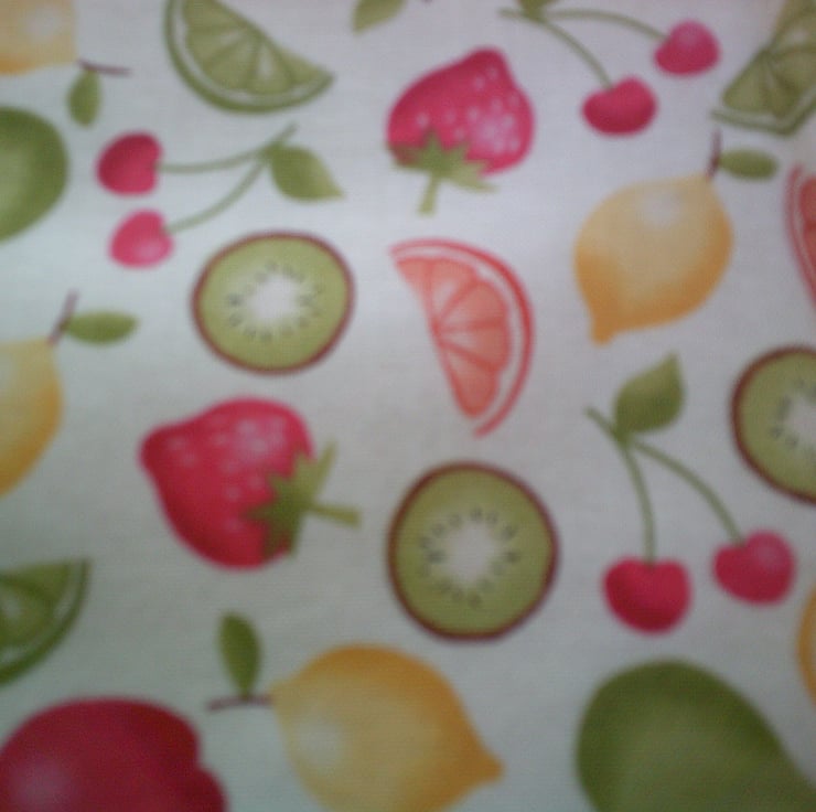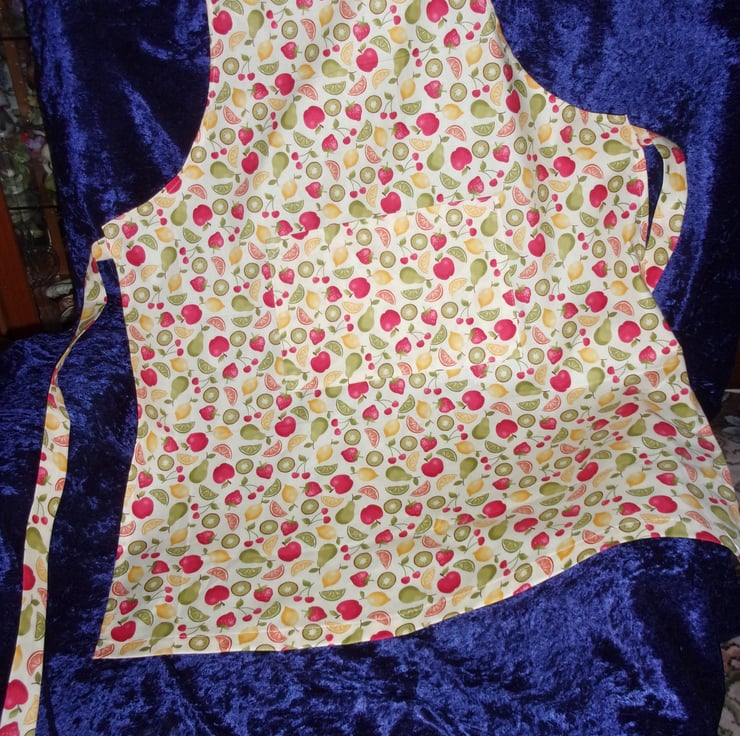The design of the fabric used for this apron is of Lemons, Orange Slices, kiwi fruit, apples, pears and strawberries on a cream background.