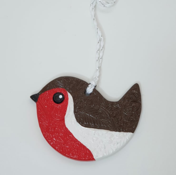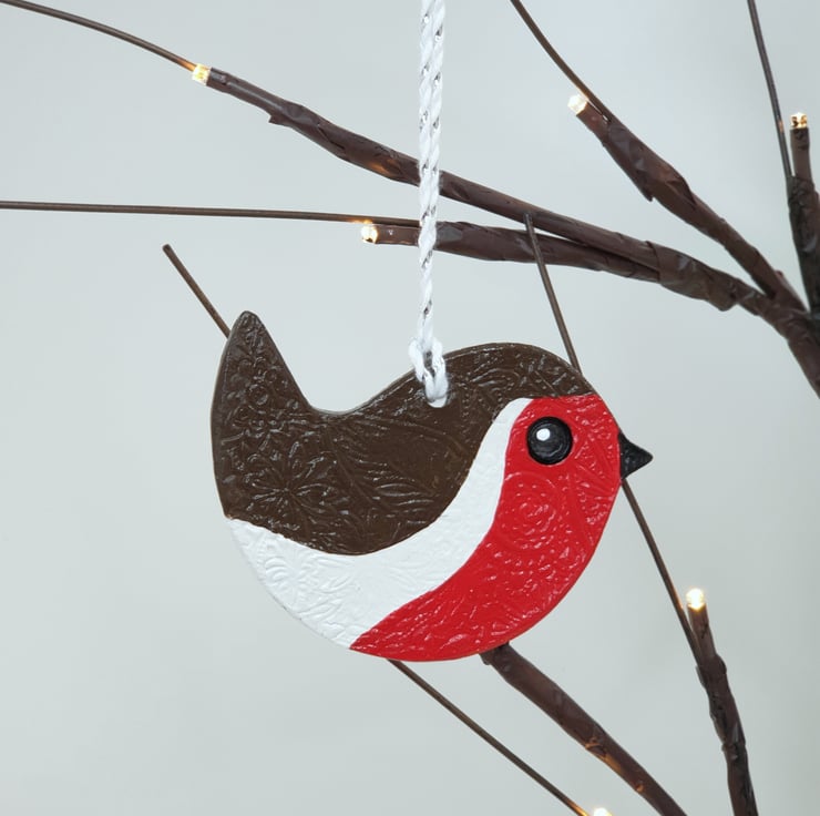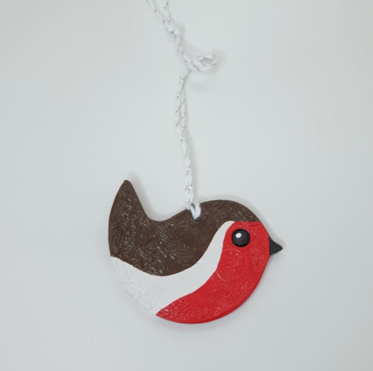 Beautiful little Robin redbreast hanging Christmas decoration which has been lovingly made from air dry clay and handpainted. Both sides of this cute little bird have been decoratively textured and painted and then varnished for added protection. This adorable little robin is supplied ready to hang from white and silver twine and as both sides are decorative it looks great when hung in a window. This gorgeous little chap would make a lovely addition to your home decor, Christmas tree or would also make a perfect little gift for a bird lover and is supplied in an organza bag finished with red ribbon.