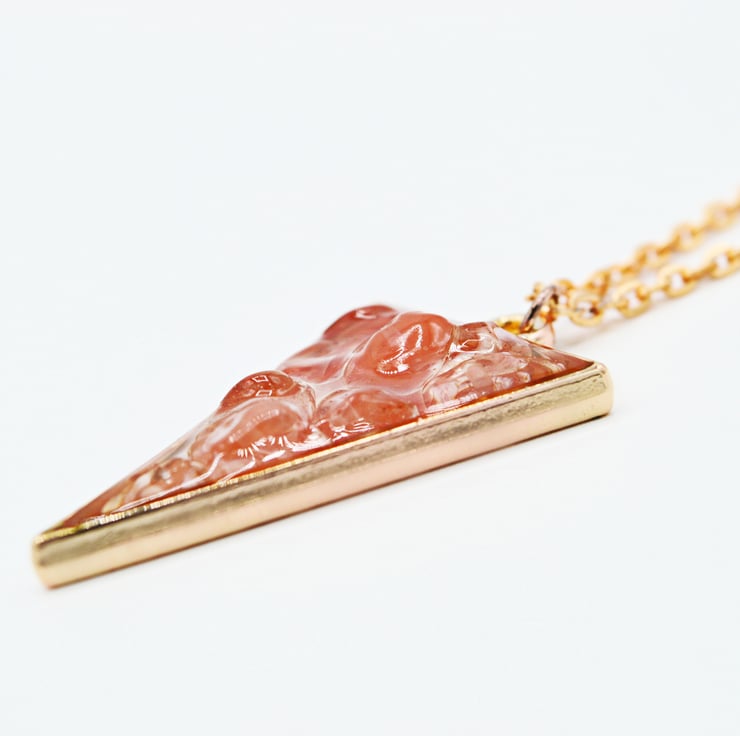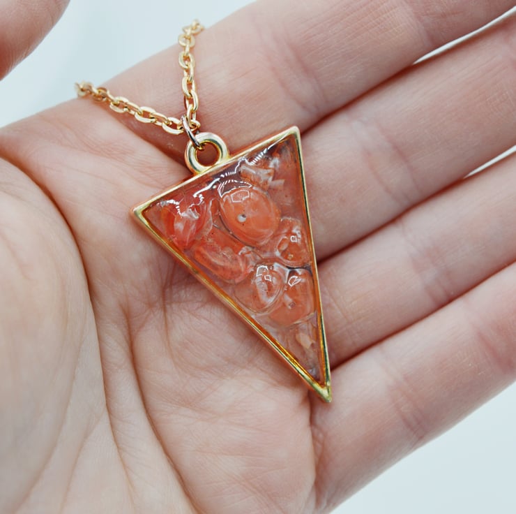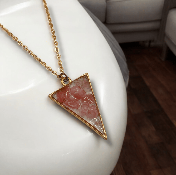 Handmade with Genuine Strawberry or Cherry Quartz chips. The tiny nuggets are cured within Vegan Friendly Eco Resin in an open rose gold-plated triangular shaped bezel, as the focal point of this collar length necklace and suspended from a rose gold-plated cable chain, completed with a lobster claw clasp.