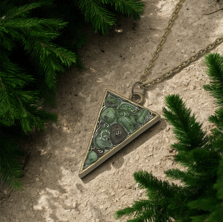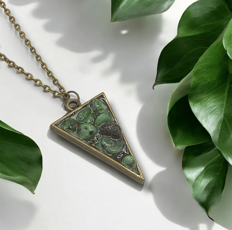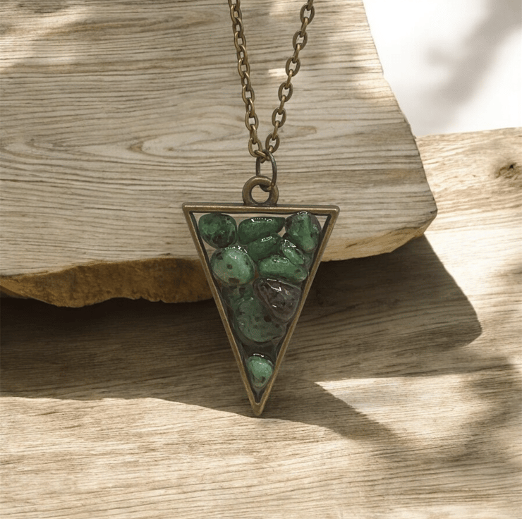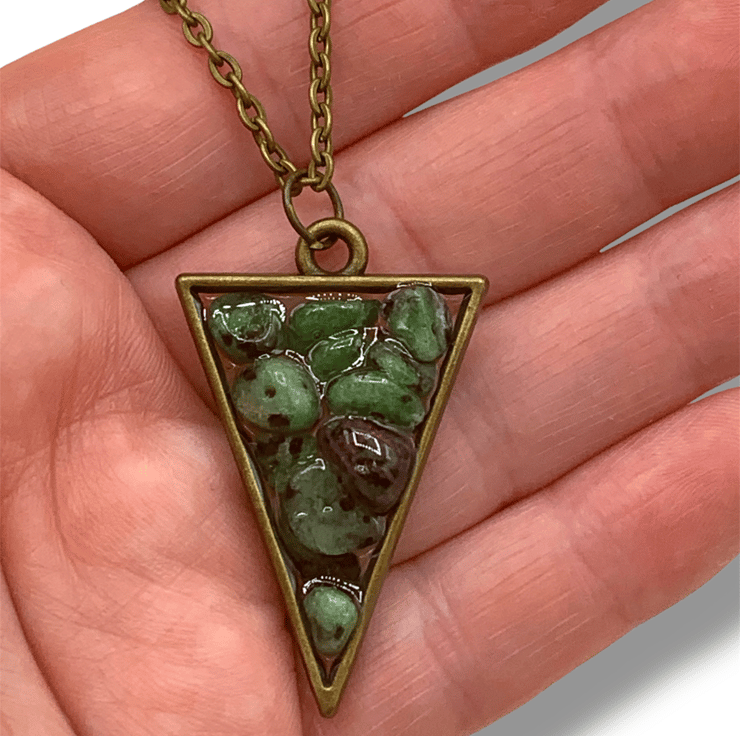 Made with Genuine Natural Ruby Zoisite chips. The tiny nuggets are embedded within resin in an open Antique-Brass plated triangular shaped bezel, as the focal point of this collar length necklace and suspended from an Antique-Brass plated cable chain completed with a Lobster Claw clasp.