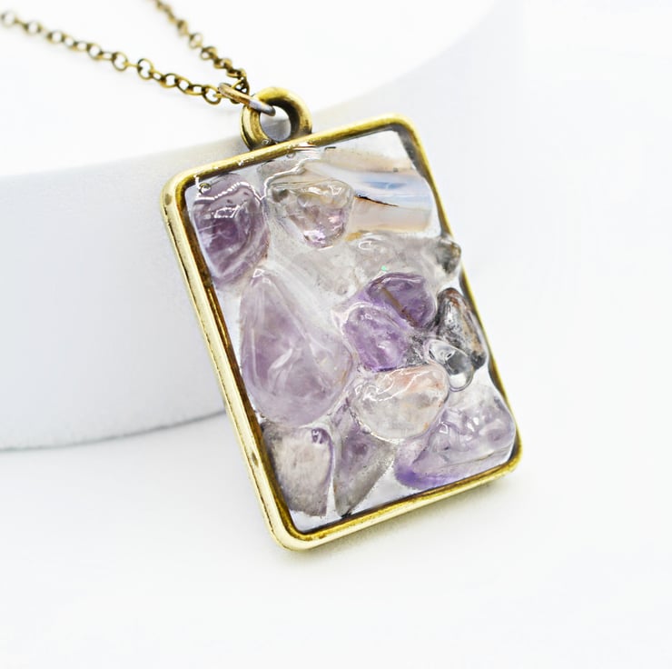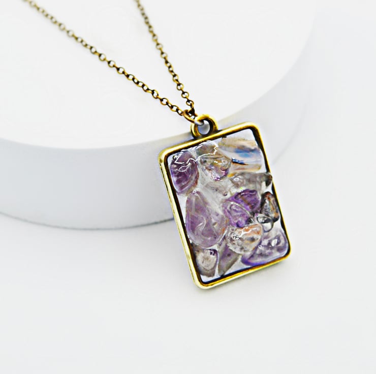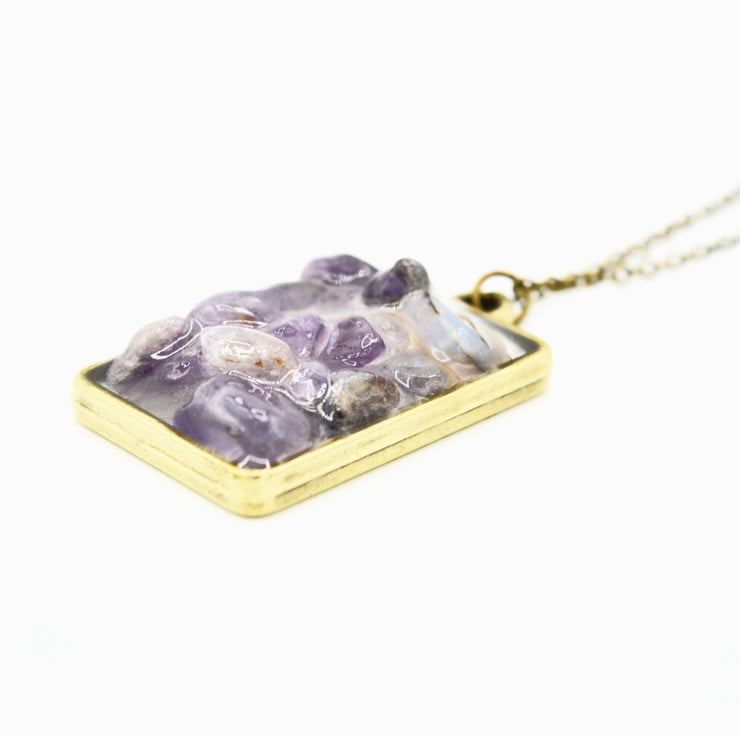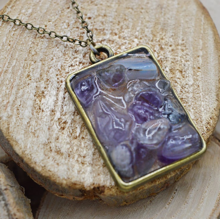 Handmade with Genuine Natural Amethyst chips. The tiny nuggets are cured within Vegan Friendly Eco Resin in an open Antique-Brass plated rectangular shaped bezel, as the focal point of this collar length necklace and suspended from an Antique-Brass plated cable chain completed with a Lobster Claw clasp.