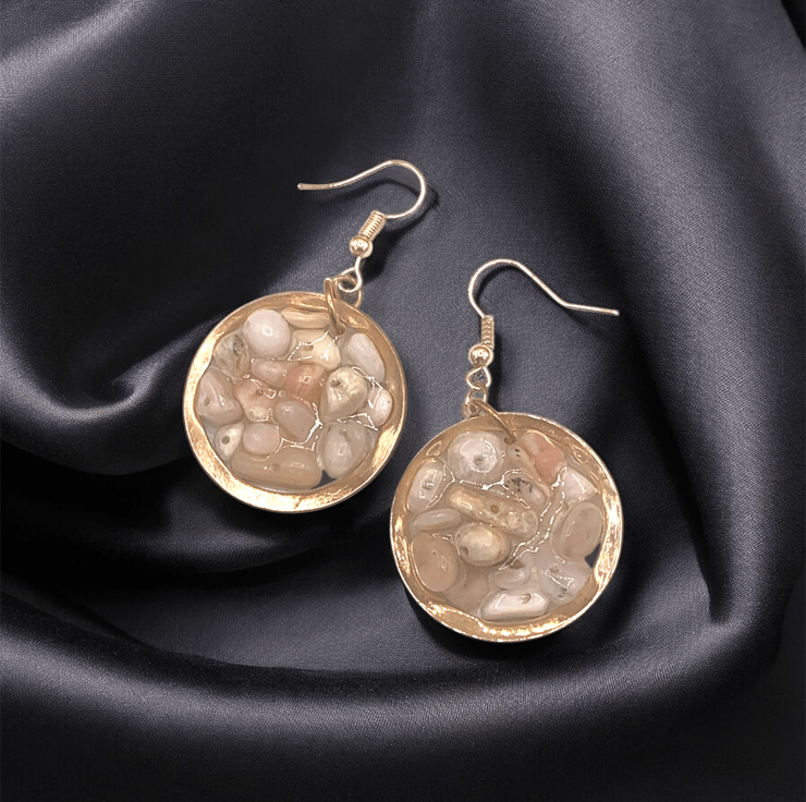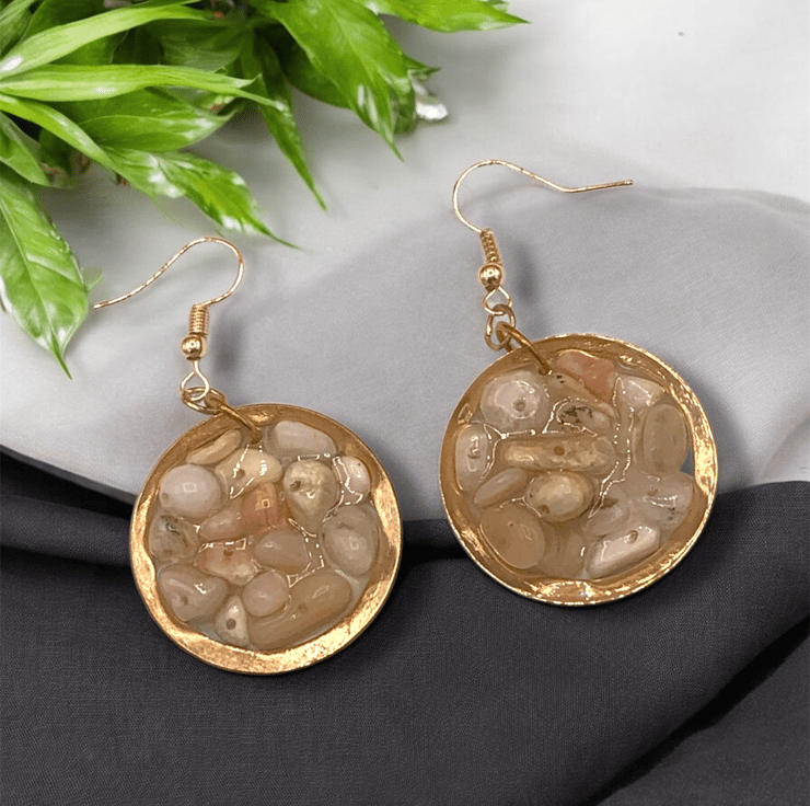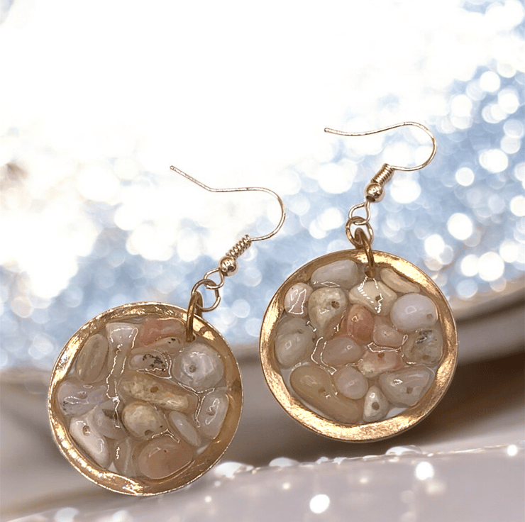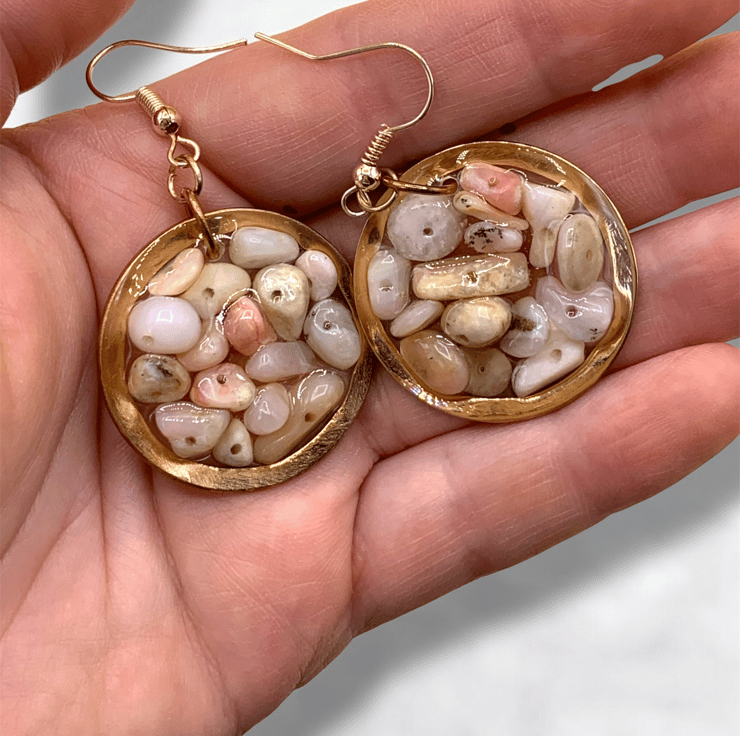 Handmade with Genuine Natural Pink Peruvian Opal chips, within an open Copper bezel and resin cured with Vegan Friendly Eco Resin, then suspended from shepherd hook ear wires.