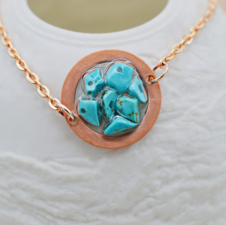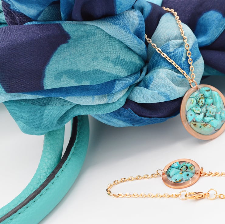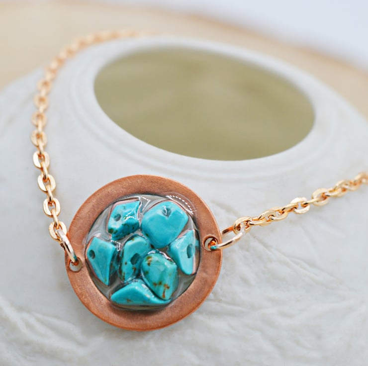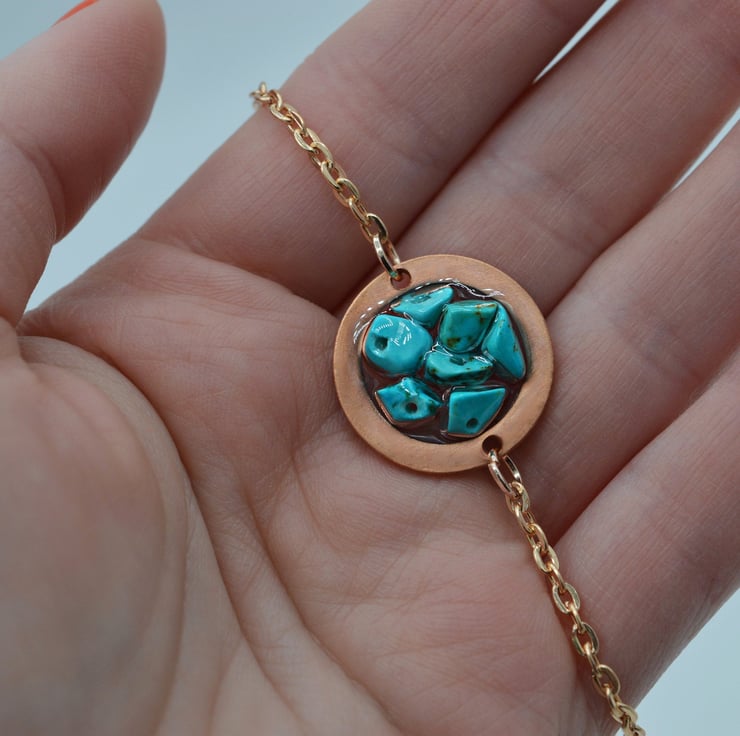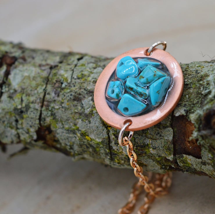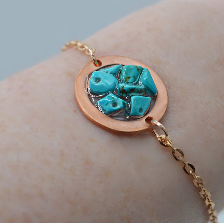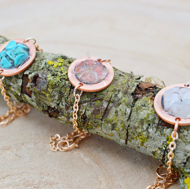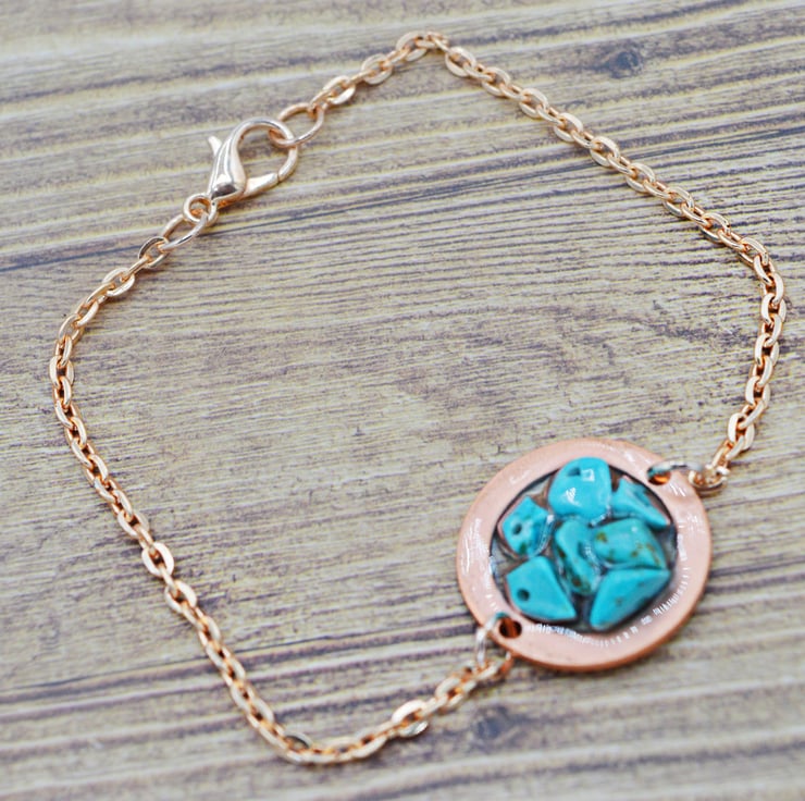 Handmade with Genuine Magnesite chips, within an open Copper bezel and resin cured with Vegan Friendly Eco Resin. The bracelet will be the length of your choice (see the chart for length options in images).