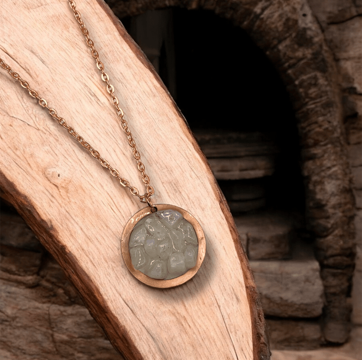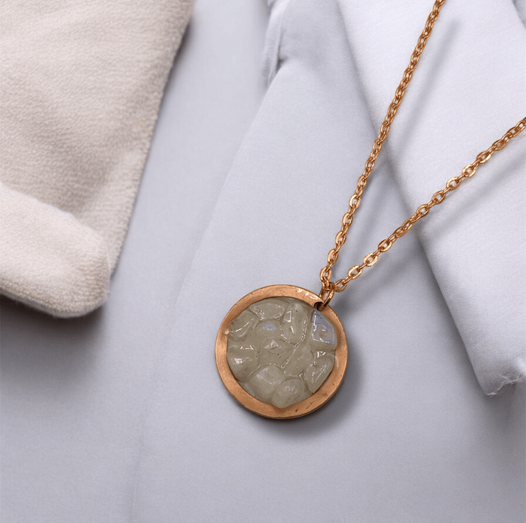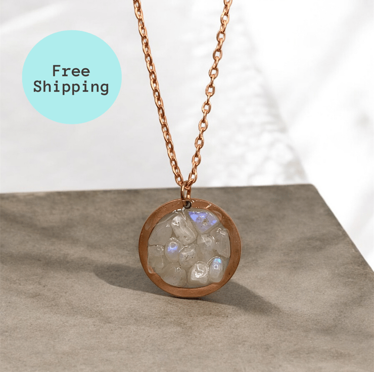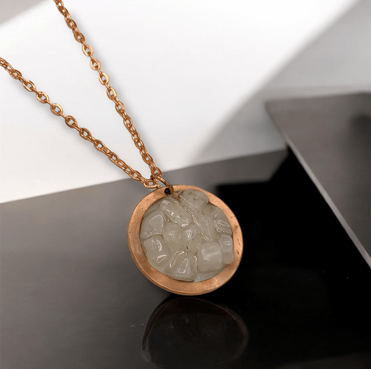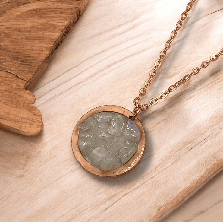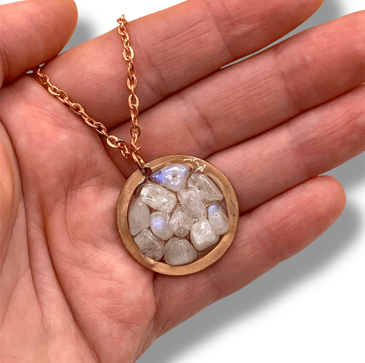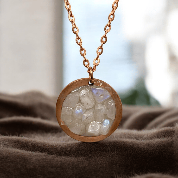 Copper & Rainbow Moonstone Pendant with Energy Benefits: Geode Inspired Design