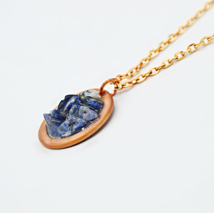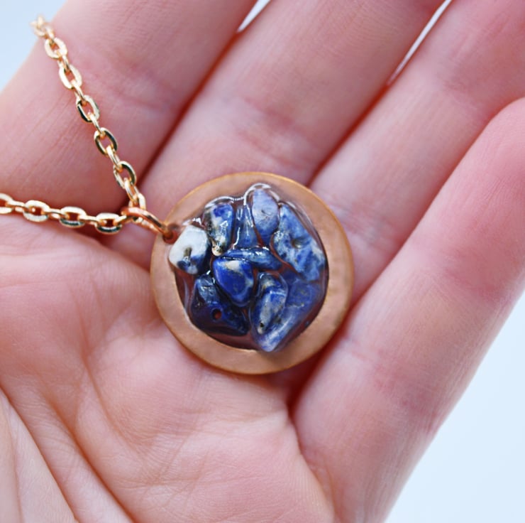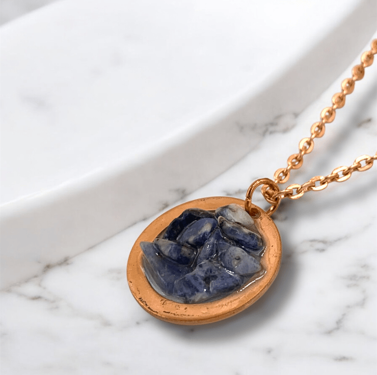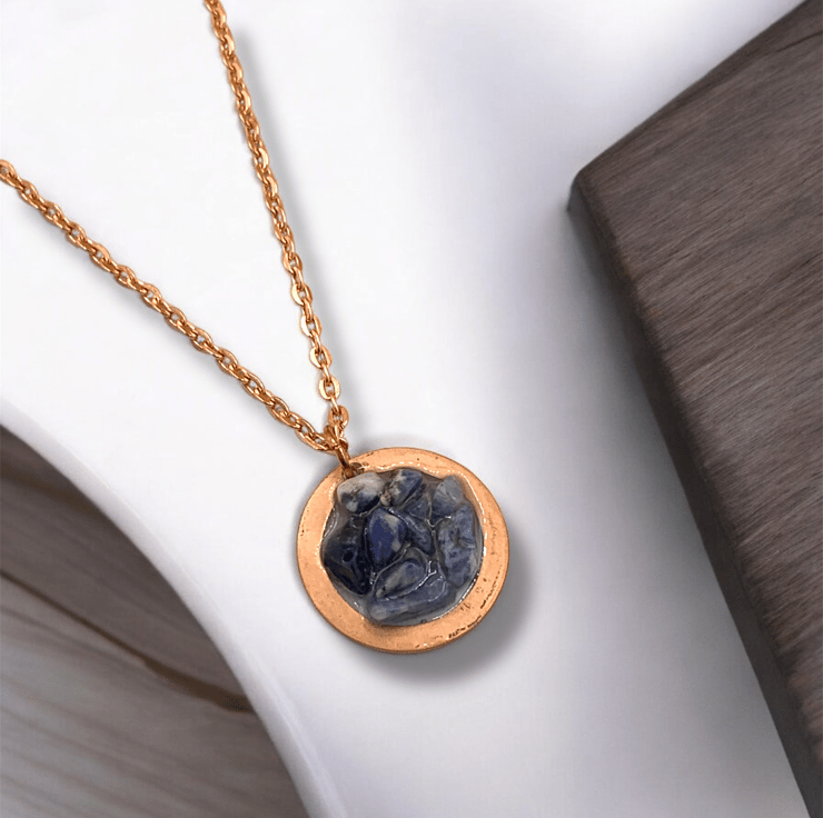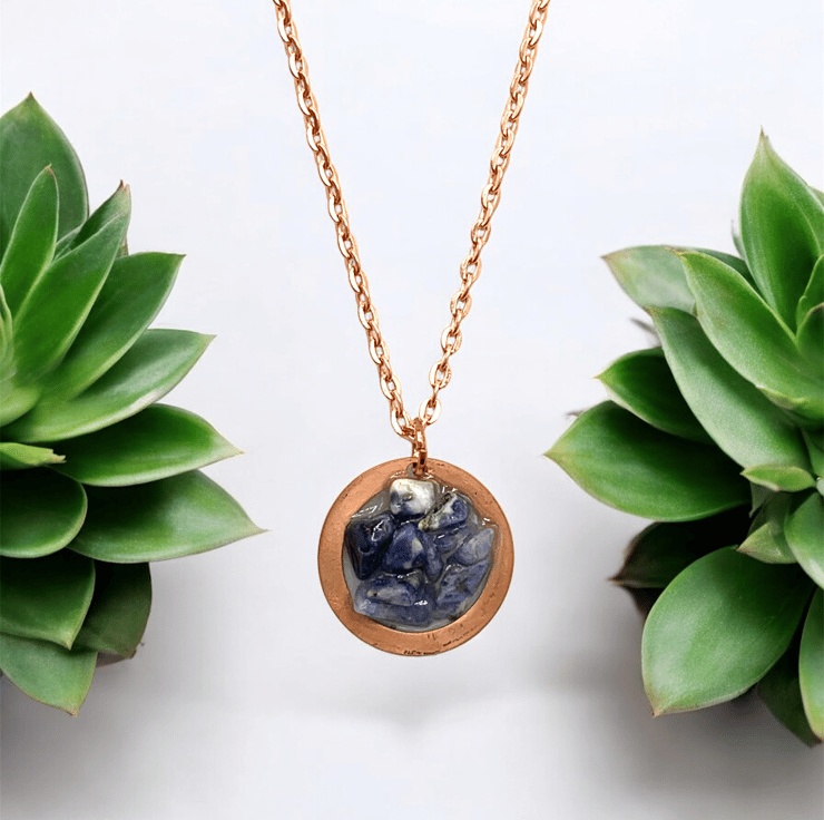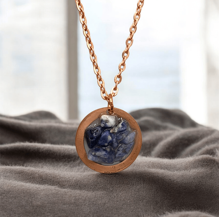 Discover the beauty and power of this Blue Sodalite & Copper Geode inspired pendant. This throat chakra gem calms the mind, promotes authentic communication, and strengthens the voice. Handcrafted to enhance your energy and style. Elevate your look with this unique piece!