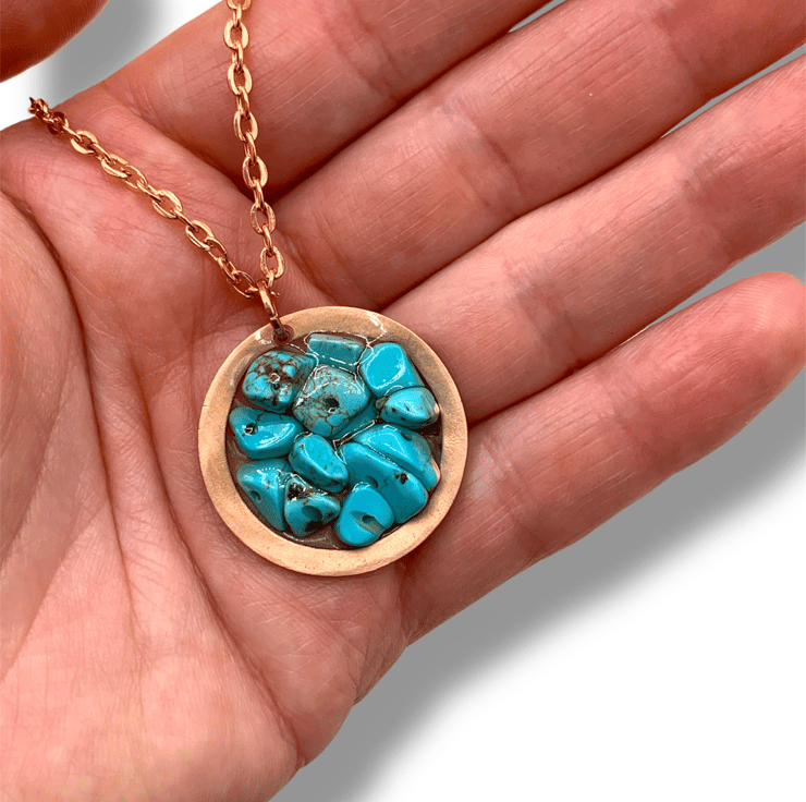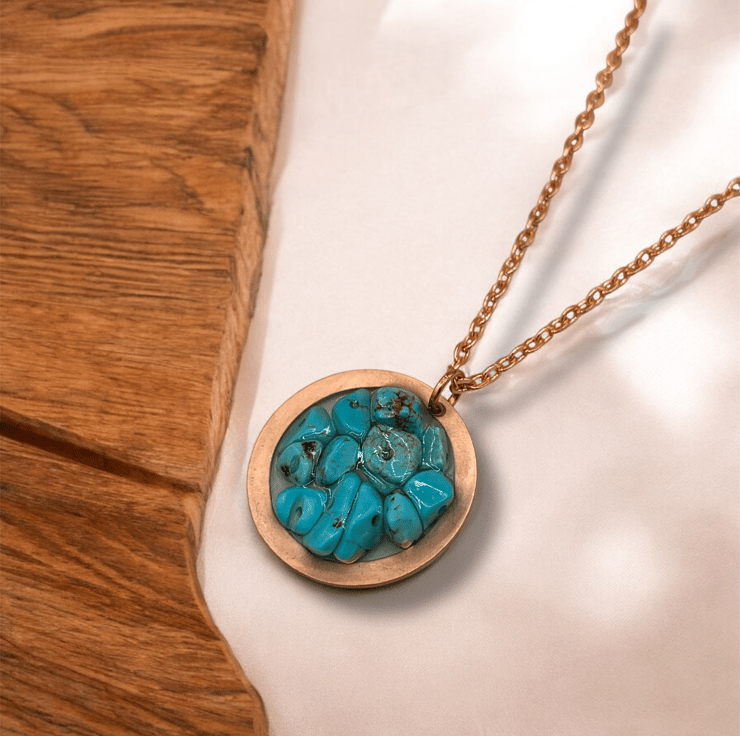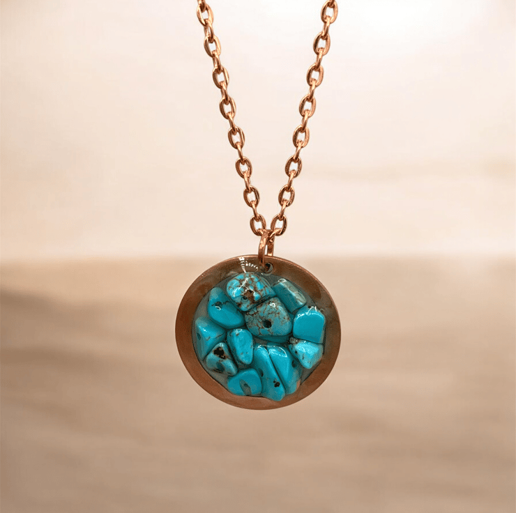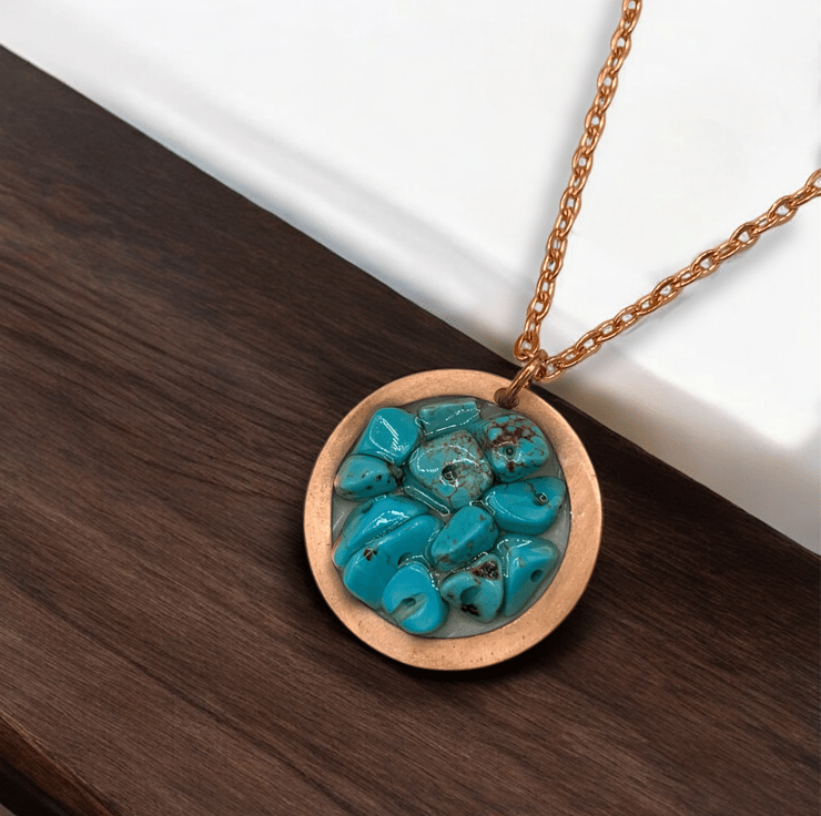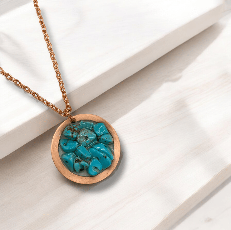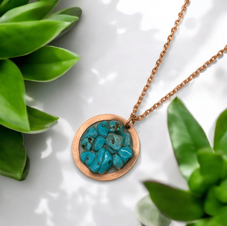 Elevate your style with this stunning Turquoise Blue Magnesite & Copper Geode inspired pendant. Perfect for the crown chakra, it calms both body and mind. Handcrafted to bring harmony and beauty into your life. Stand out in the crowd with this unique piece!