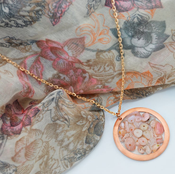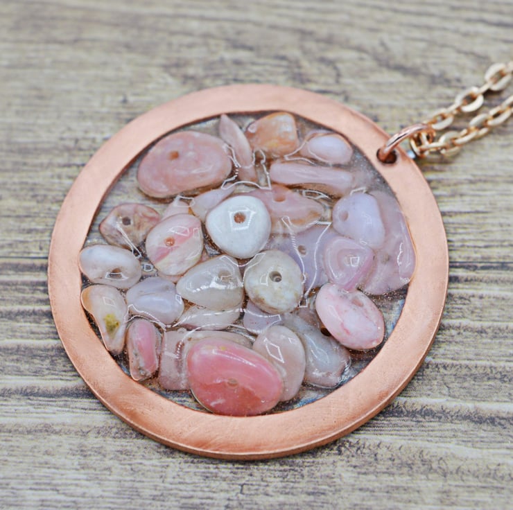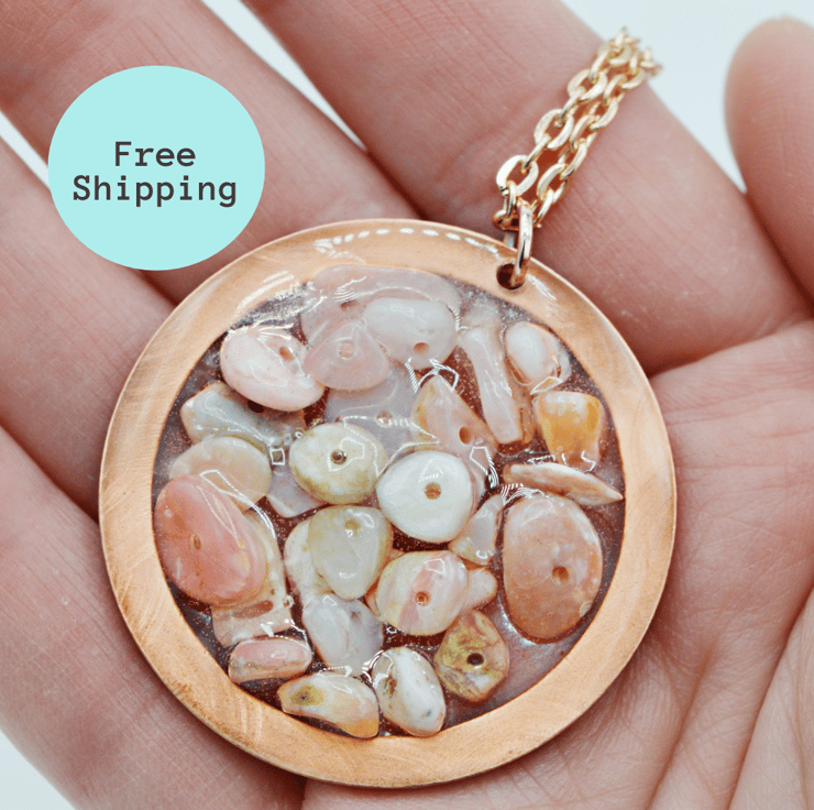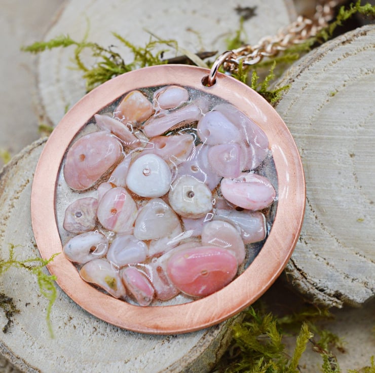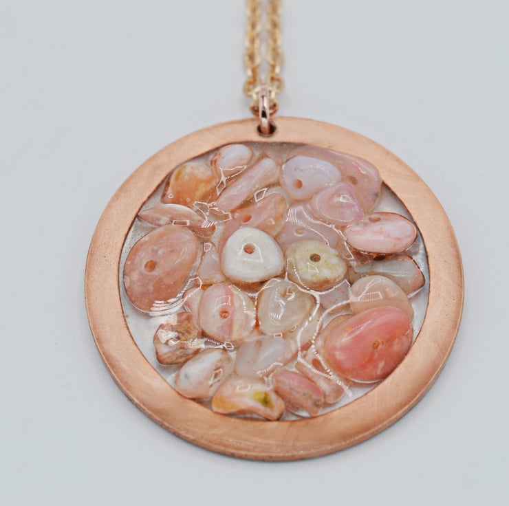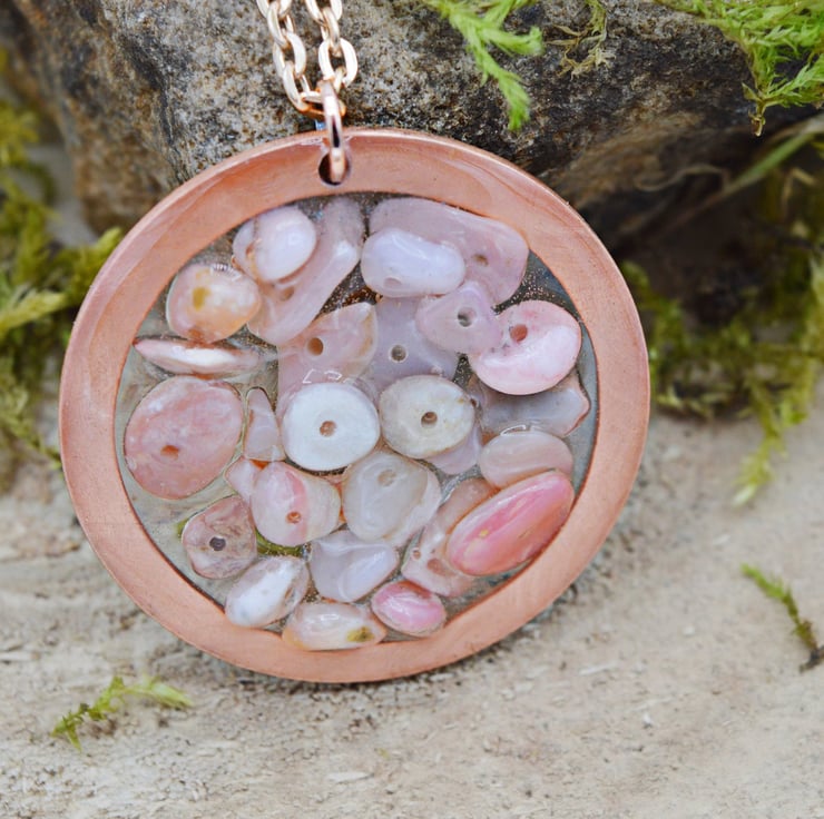 Handmade with Genuine Natural Peruvian Opal chips, within an open Copper bezel and resin cured with Eco Vegan Friendly Resin.