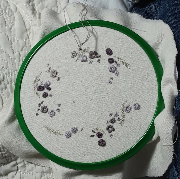 I have used various plum colours, a lovely wreath of flowers which have been hand embroidered using DMC and Perle cotton threads with various stitches.