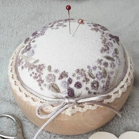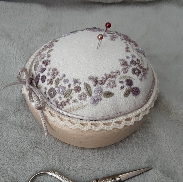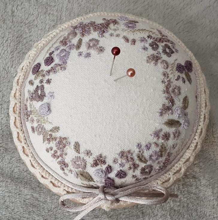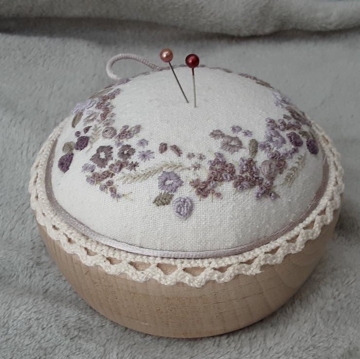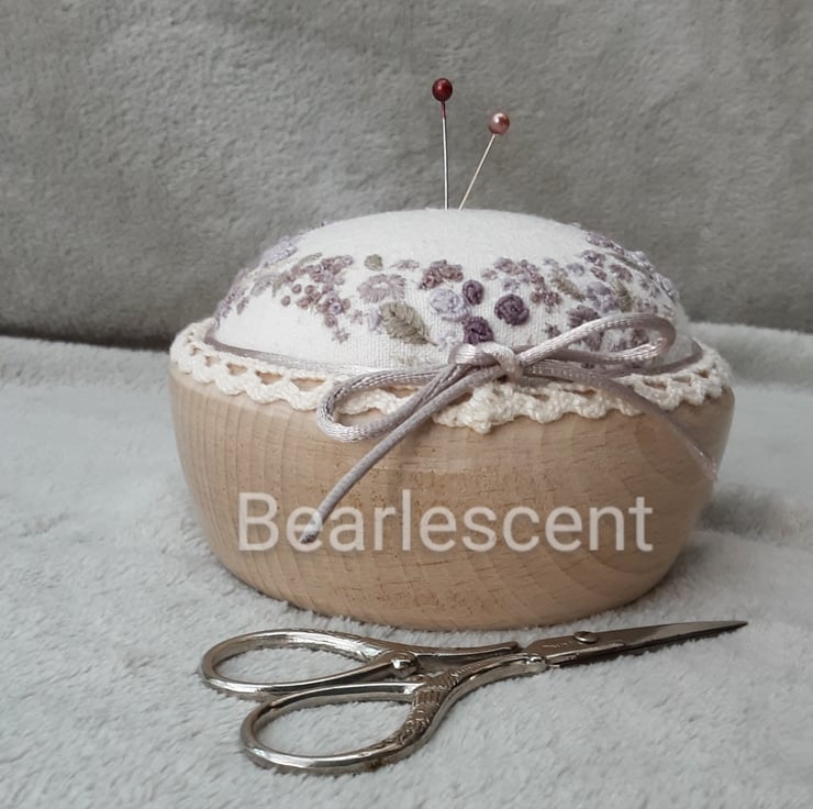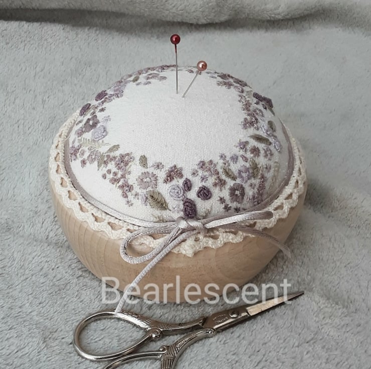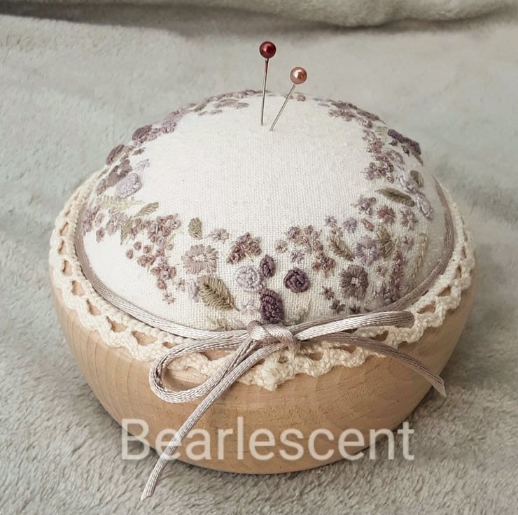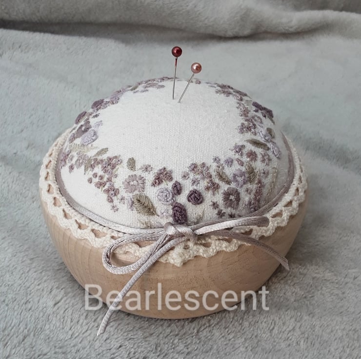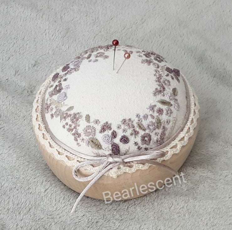 A hand embroidered unique pincushion in plums. Hand sewn pin cushion created by Bearlescent