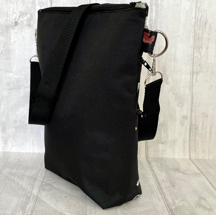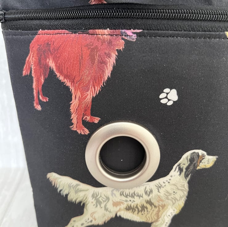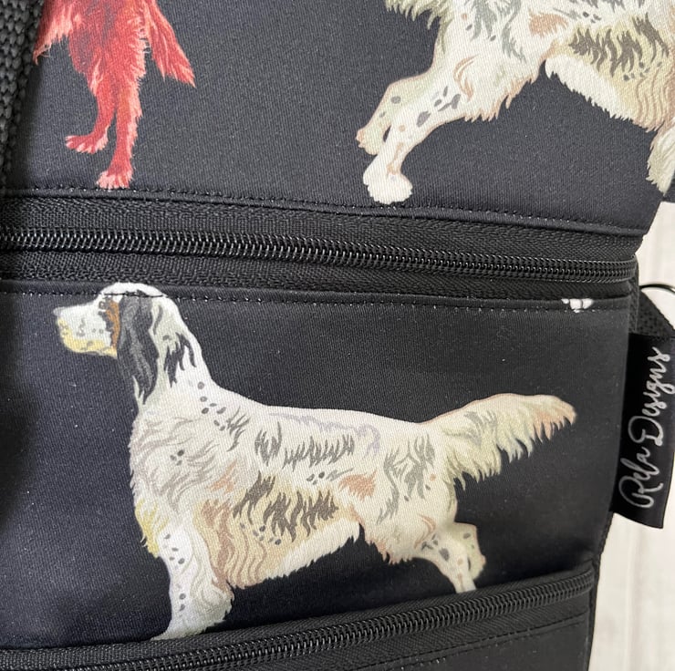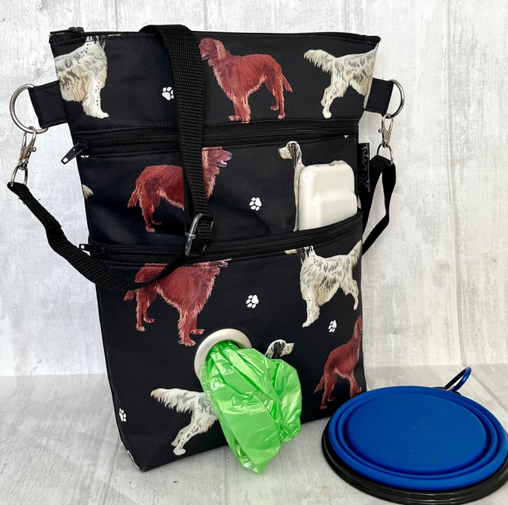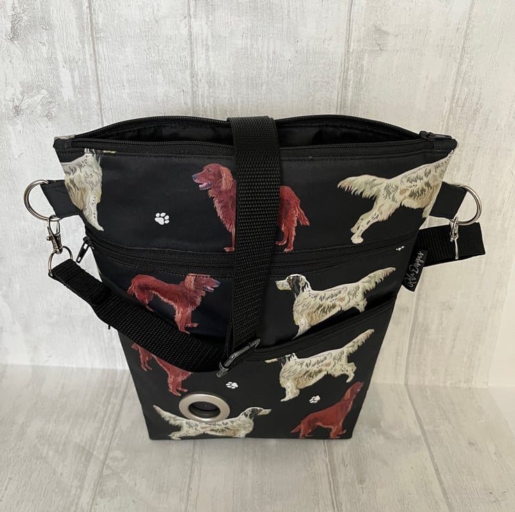 This Setter cotton print cross body dog walking bag has a plain black waterproof nylon canvas back and is lined with a black waterproof nylon lining. This handy bag will hold all your essentials for walking your dog.
