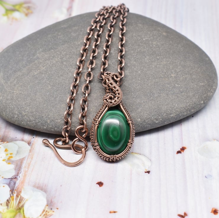 This gorgeous green of this beautiful Malachite goes so well with the oxidised copper in this dainty gothic style pendant.