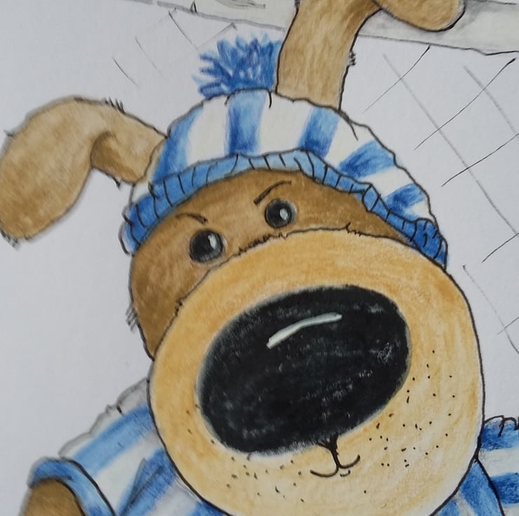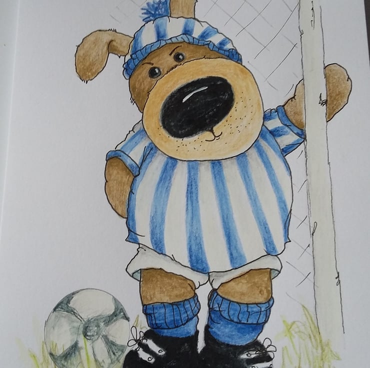 7" X5"" 250 gsm white blank card with an original hand painting of cartoon dog ready to defend his team at the local football match